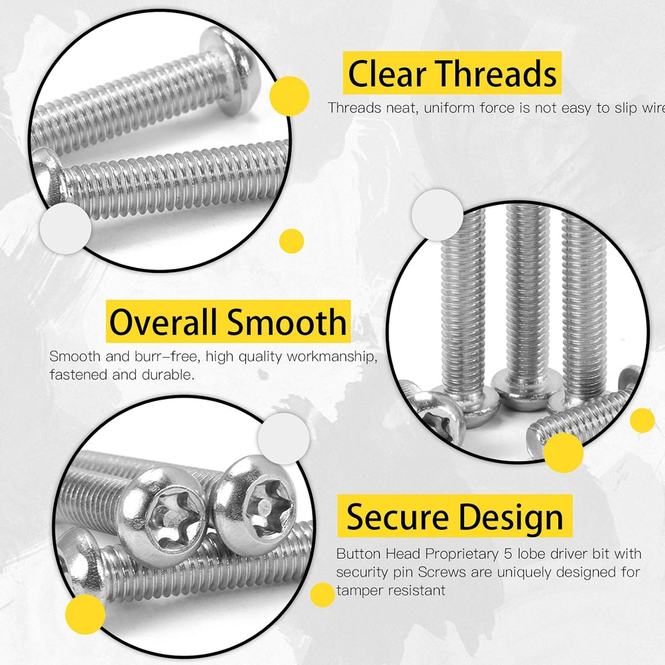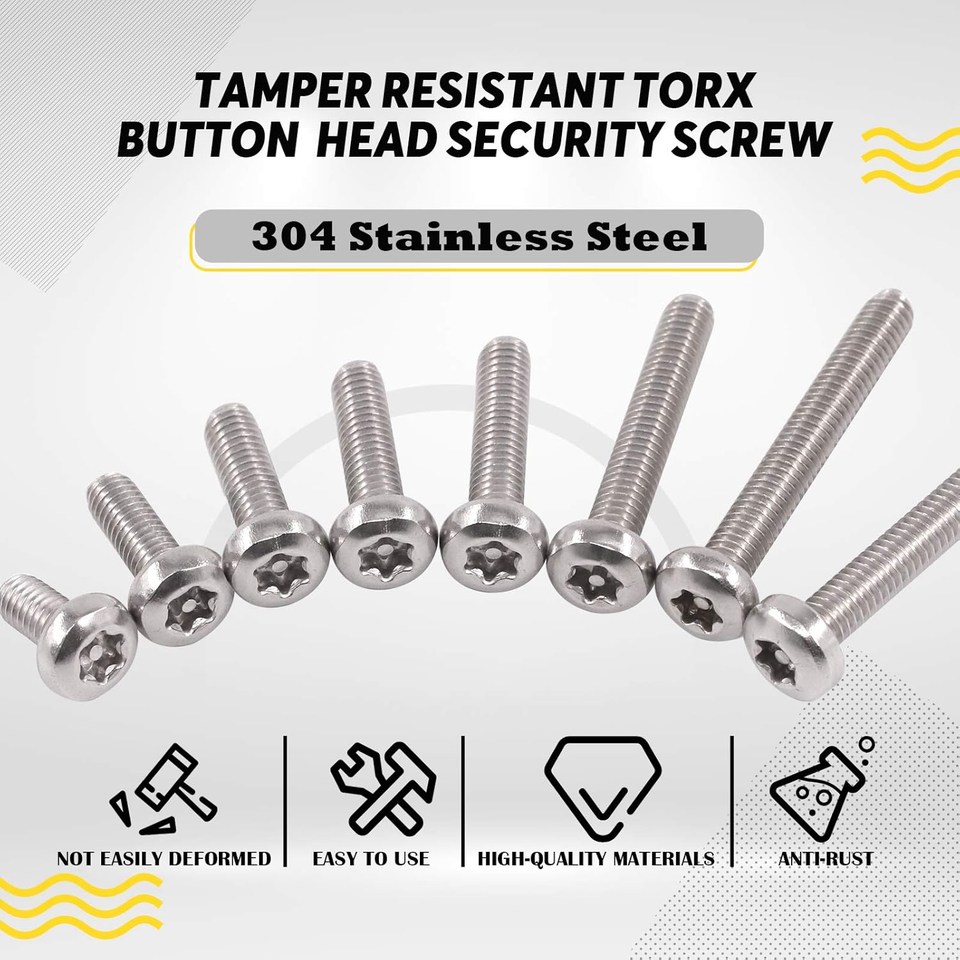 ??STEEL QUALITY MATERIAL?These button head torx security screws are made of consistent quality stainless steel, so it is tough enough to withstand bad environment. Rust proof and corrosion proof material properties and that are promising a long service life.