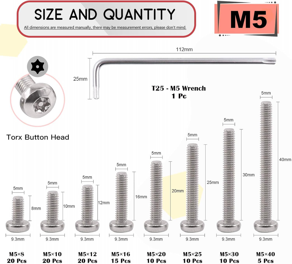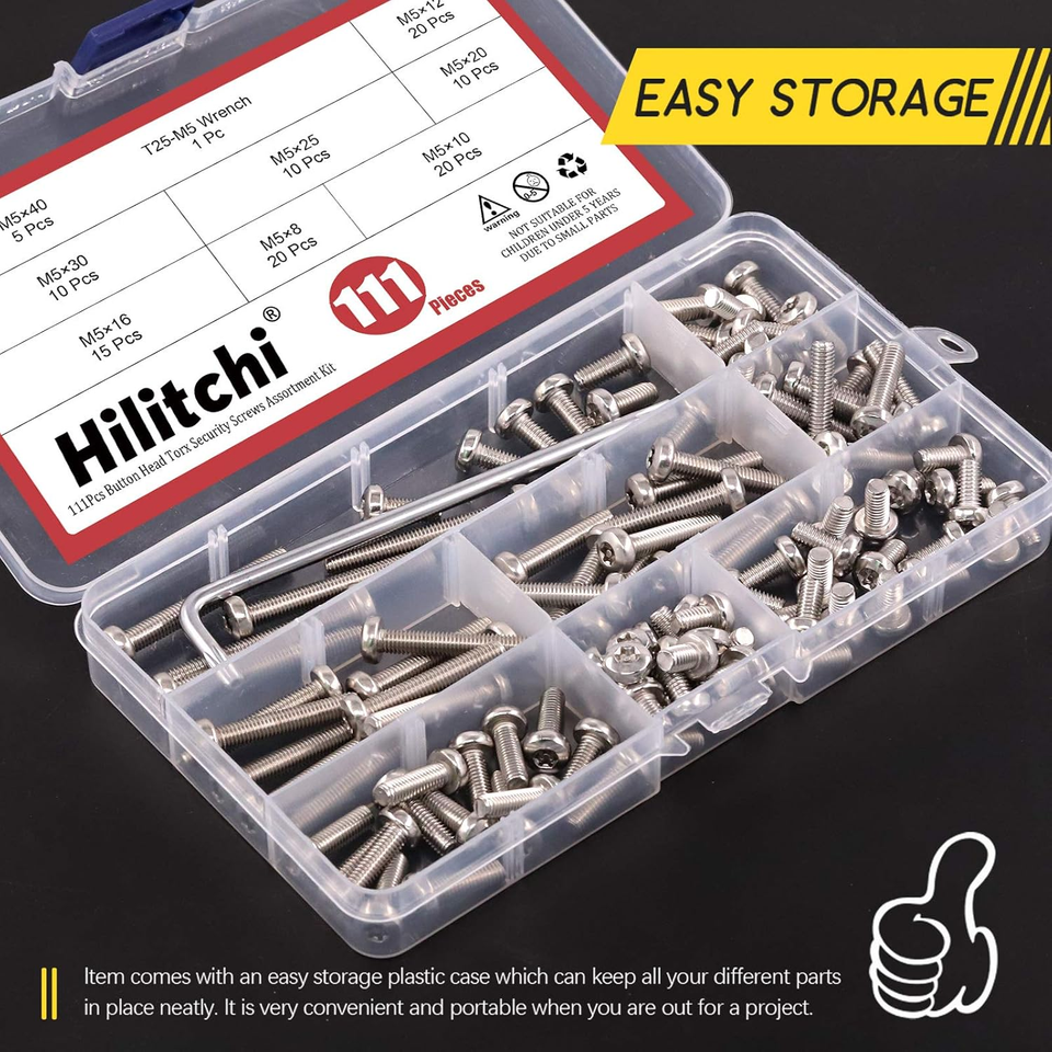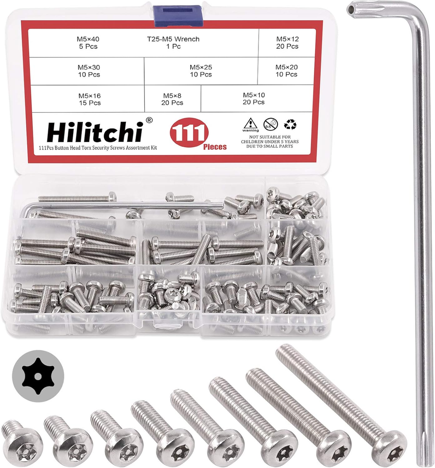 110Pcs 8Sizes M5 Button Head Torx Security Screws Stainless Steel Tamper Proof Screws w T25 Bit, M5x8/10/12/16/20/25/30/40