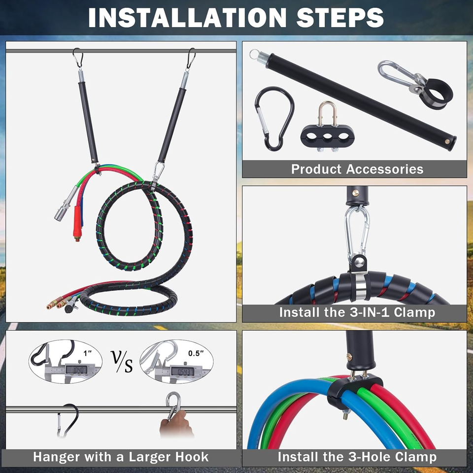 Keeps air hoses and power cords secure and protected in trucks, semi-trucks, trailers, and tractors. Prevents dragging, tangling, and damage to lines while ensuring a neat, professional setup.