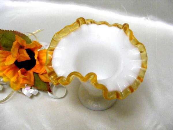 Up for your consideration is a No.7352 (GC) Goldcrest Triangle Vase made by Fenton Art Glass Company from 1948 to 1954. It has a delightful goldcrest ruffle that rings around the top. What a very pretty addition to your collection or give as a cherished gift.