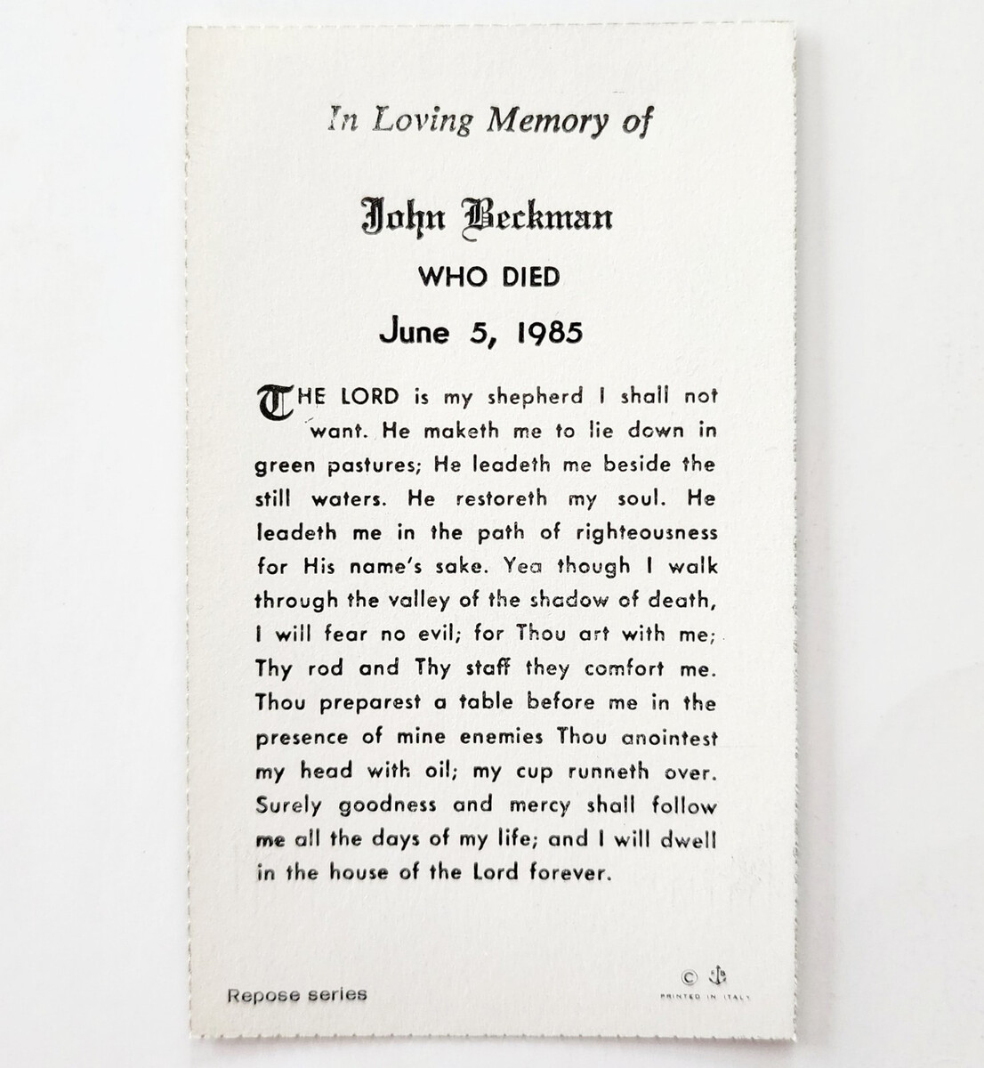 1985 Prayer Funeral Card John Beckman Italy Print Flowers Cross Religion E10