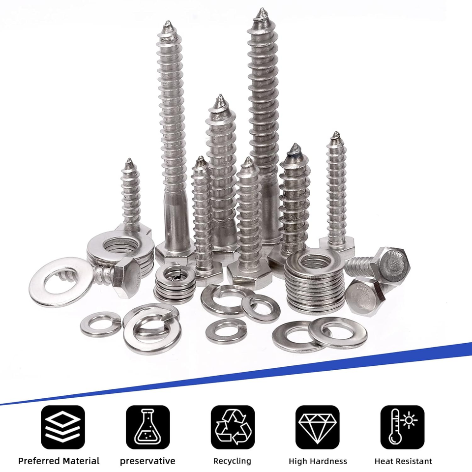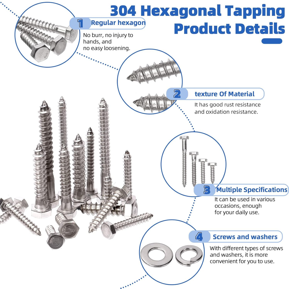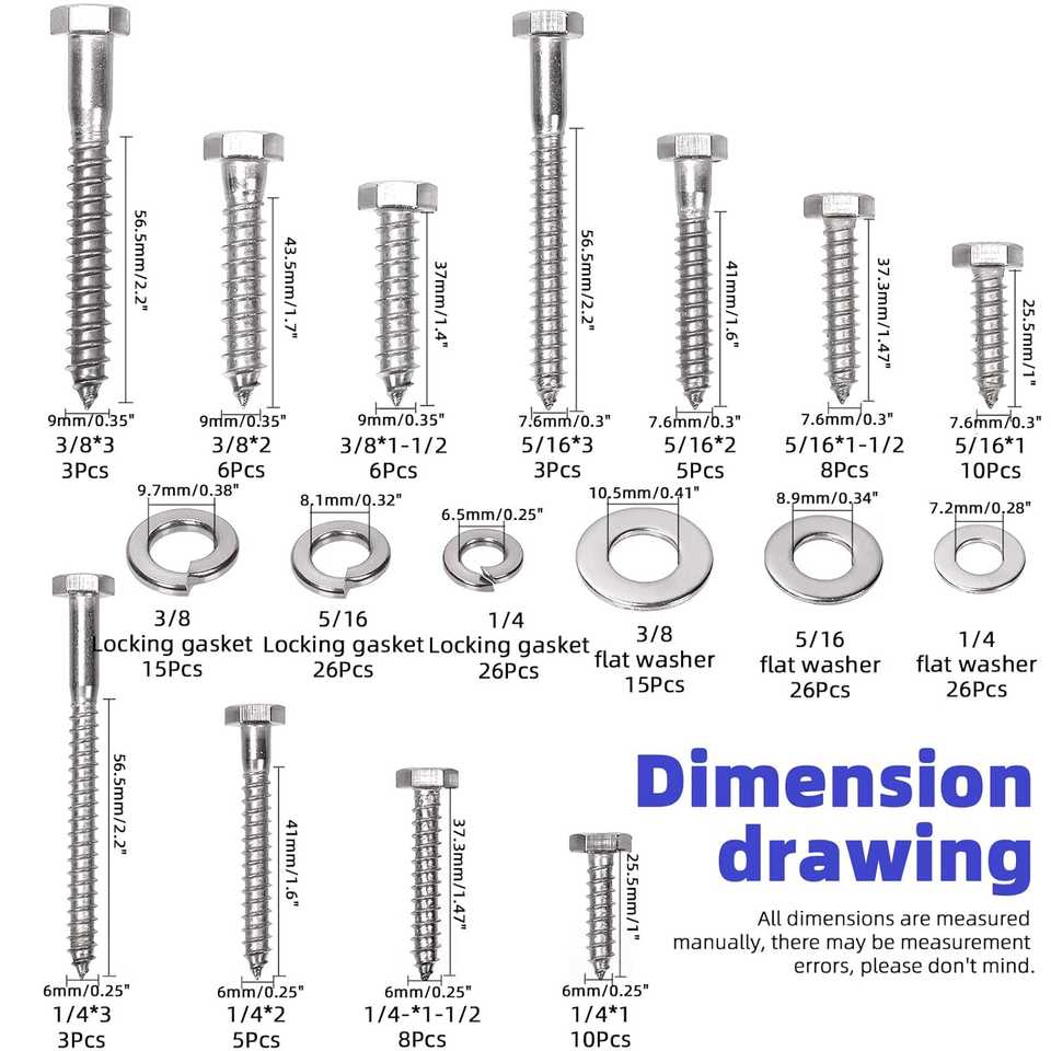 - 201pcs 304 Stainless Steel Hex Lag Screws Assortment Kit 1/4 5/16 3/8 Bolts Set