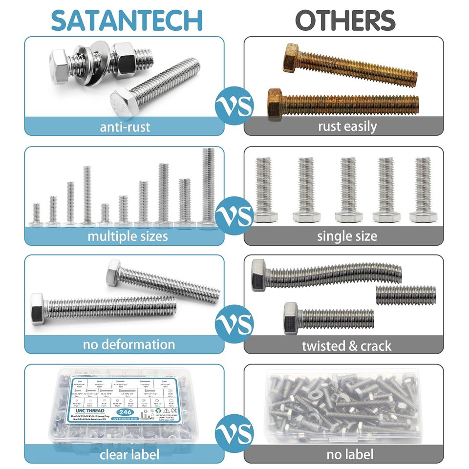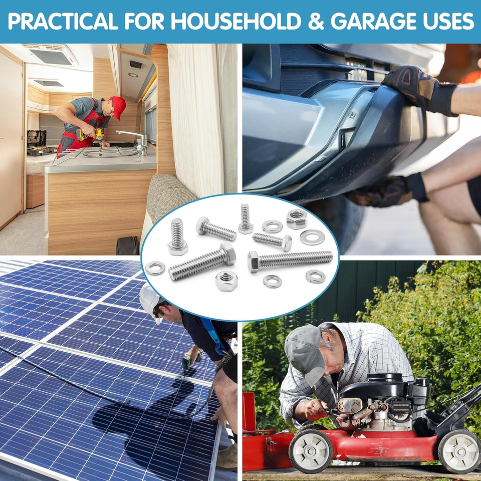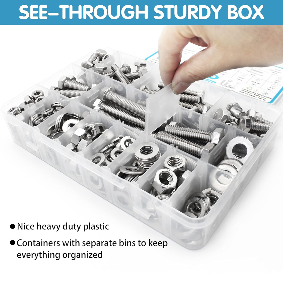 - 246pcs Stainless Steel Hex Bolts Nuts Washers Kit 1/4-20 5/16-18 3/8-16 Assortme
