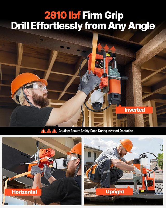 Strong Magnetic Force: The mag drill press is built with a thick, high-purity iron base for up to 2810 lbf / 12500 N magnetic force. It stays firmly in place even on vertical or sloped metal surfaces, ensuring stable and secure drilling