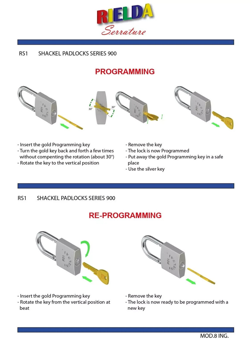 RIELDA offers a wide range of Re-programmable shackle Padlocks with several shackles length and body size. The padlock cases are constructed of quality brass with shackles of stainless steel for corrosion protection or hardened steel for protection against sawing and cutting and provide better tensile strength to resist pulling attack. All the shackle padlocks incorporate picklock functions and stainless steel inserts to provide resistance to corrosion and drilling attack. Rubber weather seals around the leg and chrome finishes make this padlocks suited to harsh weather conditions. Drainage holes prevent freezing. The shackle padlock can be keyed into a master key system. Special drainage channels allow water to flow through the padlock rather than getting trapped inside and freezing during the cools weather. All the Re-Programmable padlocks series can be keyed into RIELDA Re-Programmable Master Key Systems. All the Re-programmable Padlocks are designed with the patented "Double-Locking-System" which offer high resistance against pulling. Patented key control. Restricted, factory registered key system with exclusive key codes assignment available on request. Typical applications are gates, cash boxes, lockers, tool b oxes, box in car and lorry, truck rear door, and cabinets, motor cycle, storage rooms doors, grilles, shop windows, trailers, railway wagons, power stations, fuel and hydraulic tank, switches cabinet. door in factory warehouse.