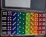 You will get a storage box,50 pieces 6 sided dice set 10 translucent colors.black,dark blue,light blue,purple,red,rose red.yellow-green.green.light yellow,orange,5 per color.