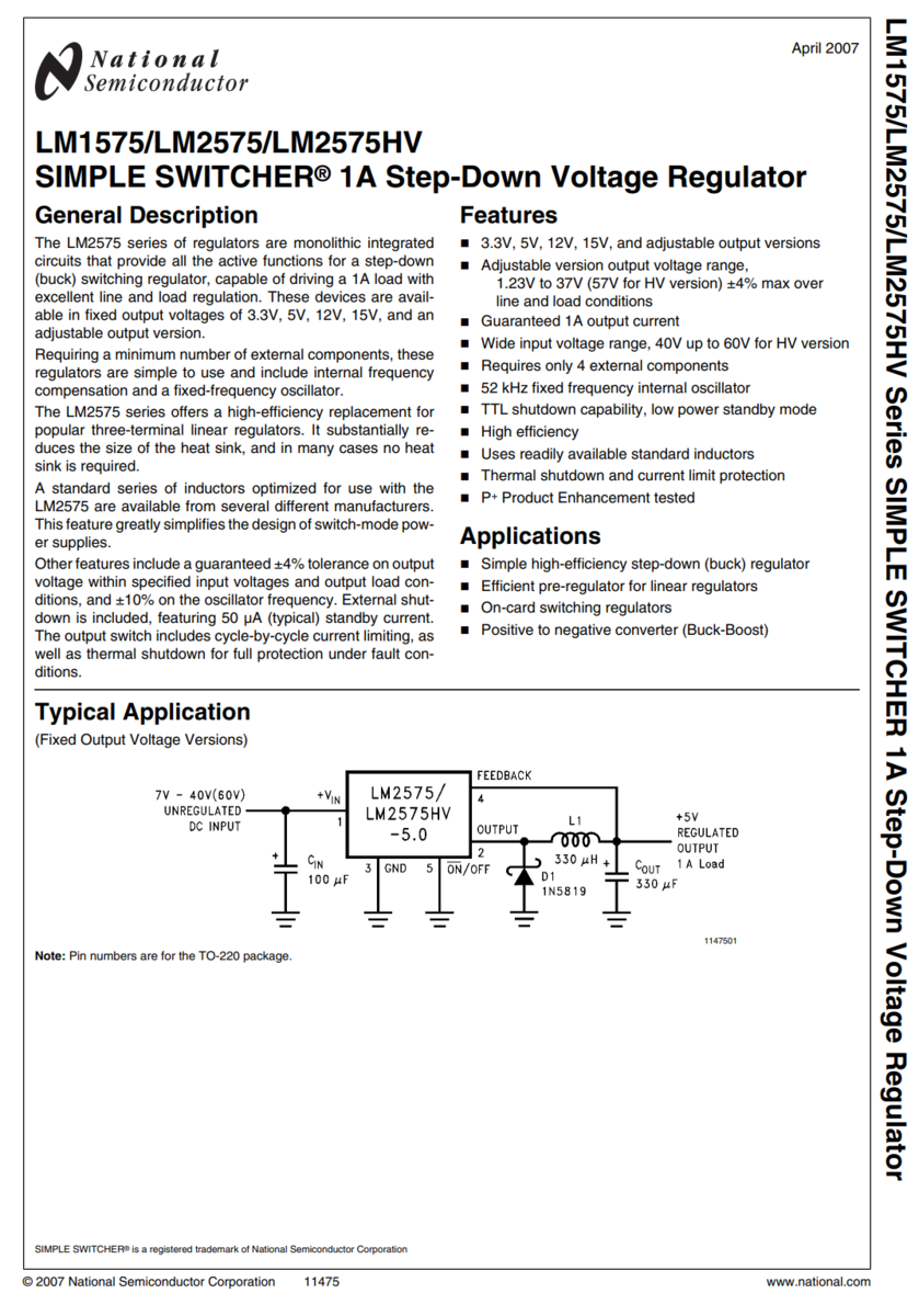 5X LM2575T-ADJ National Semiconductor 1A Step Down Switch Mode Regulator Adjustable 52kHz TO-220-5