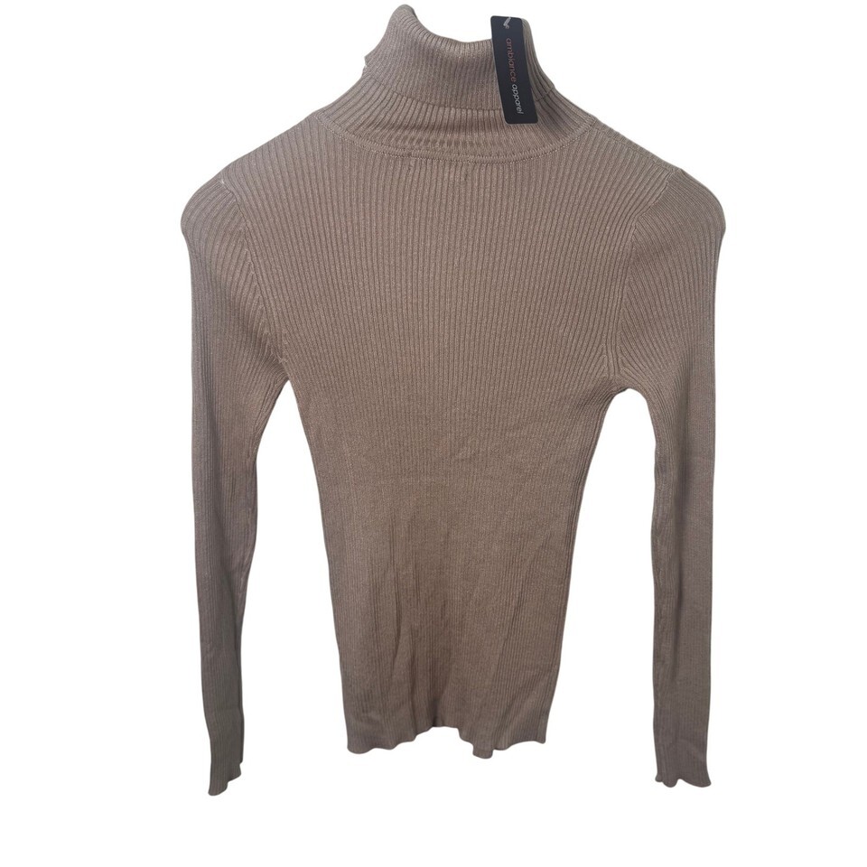 Keywords: Ambiance Apparel, turtleneck, sweater, ribbed knit, long sleeve, beige, casual, pullover, women's, top, small, S, knitwear, cozy, stylish
