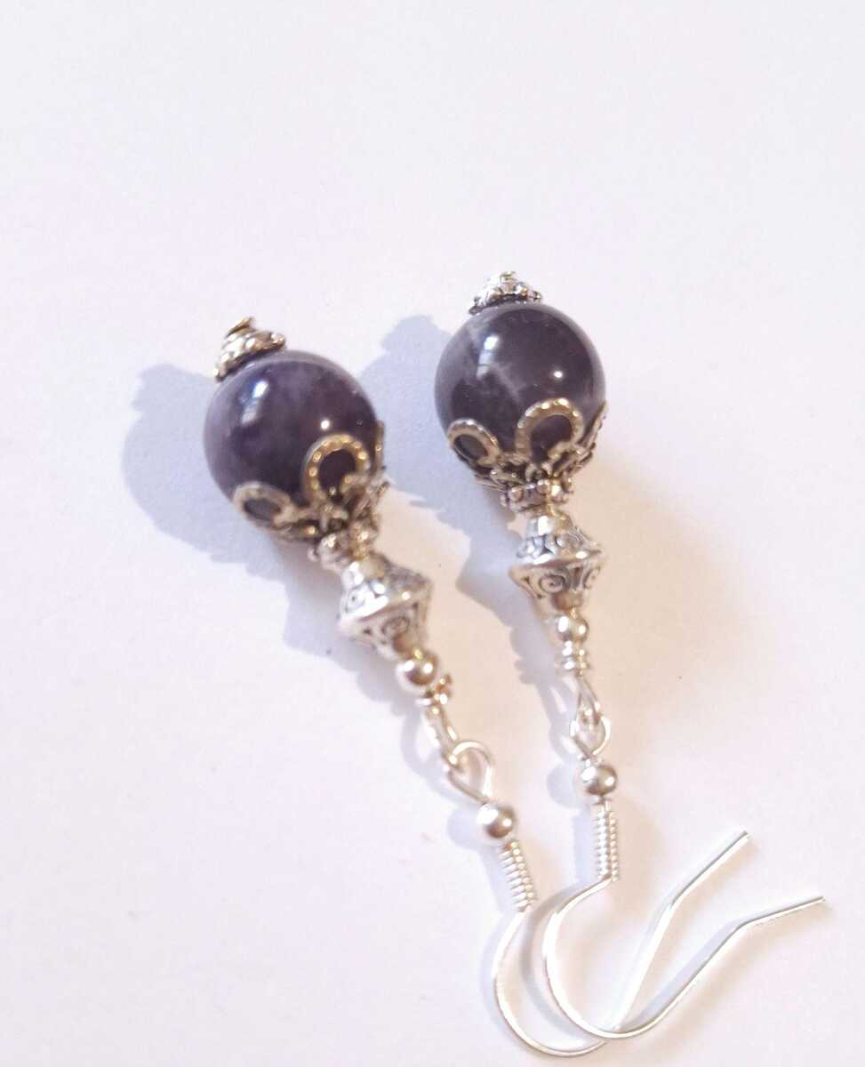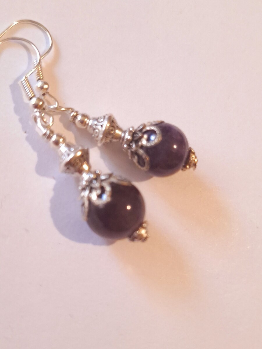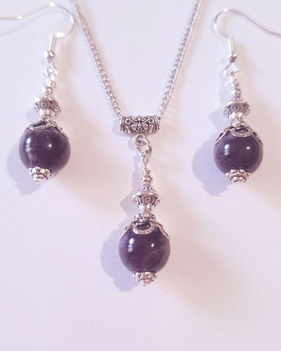 Beautiful Set of silver-tone ornament beads and Genuine Amethyst necklace and earrings. Silver-tone Victorian style necklace and earrings. Boho necklace. Bohemian necklace and earrings. Romantic necklace and earrings. Beautiful necklace with same style earrings with Genuine Amethyst. The color of a Amethyst may varied because of the natural shape and colors of a genuine Amethysts.