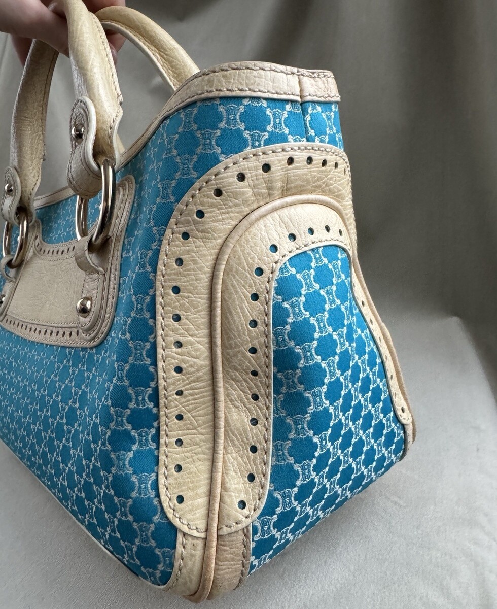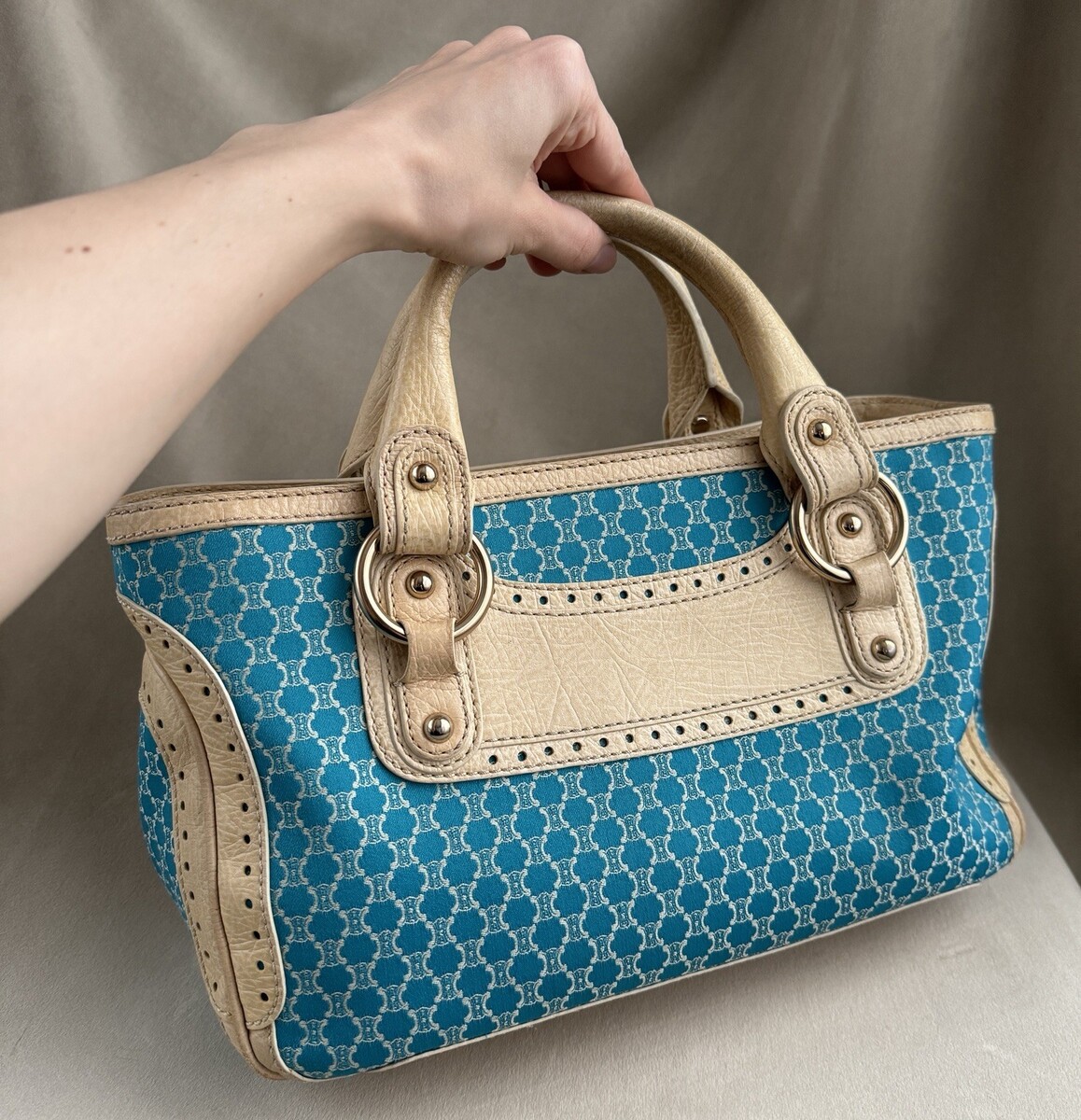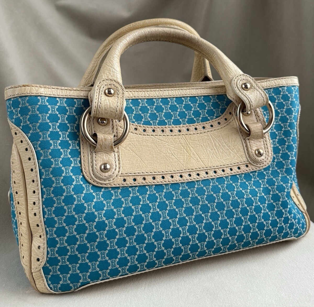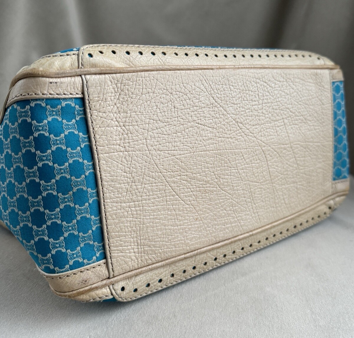 Céline Macadam Canvas Cream Leather Hand Bag Aquamarine Blue Purse