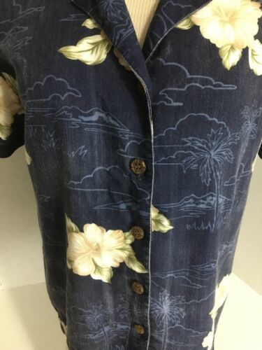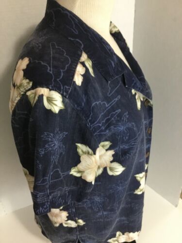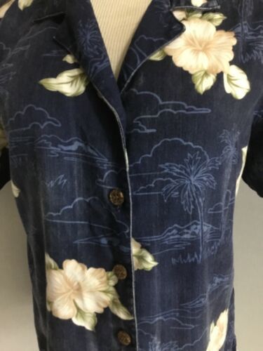 Carribean Joe Vtg Ladies S Navy Blue Cream Hibiscus Front Button Up Shirt Top