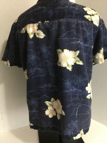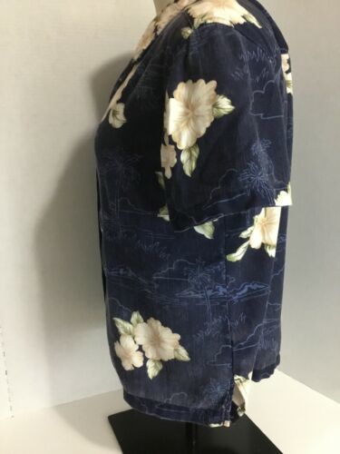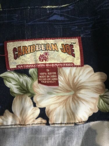 Carribean Joe Vtg Ladies S Navy Blue Cream Hibiscus Front Button Up Short Sleeve. Condition is Pre-owned. Shipped with USPS First Class Package. Chest measurement 40”,length 22”, 40” around bottom. Kick pleat both sides bottom.