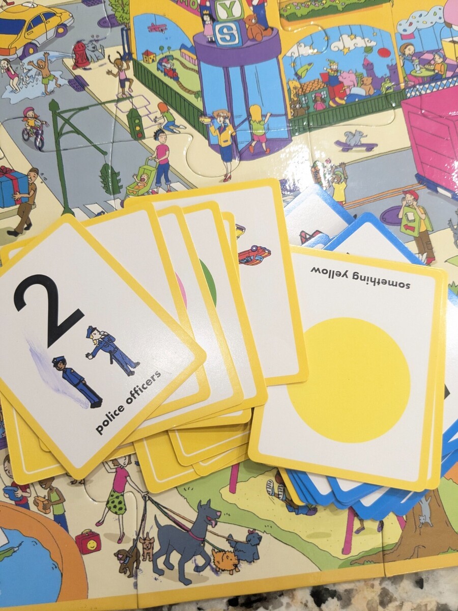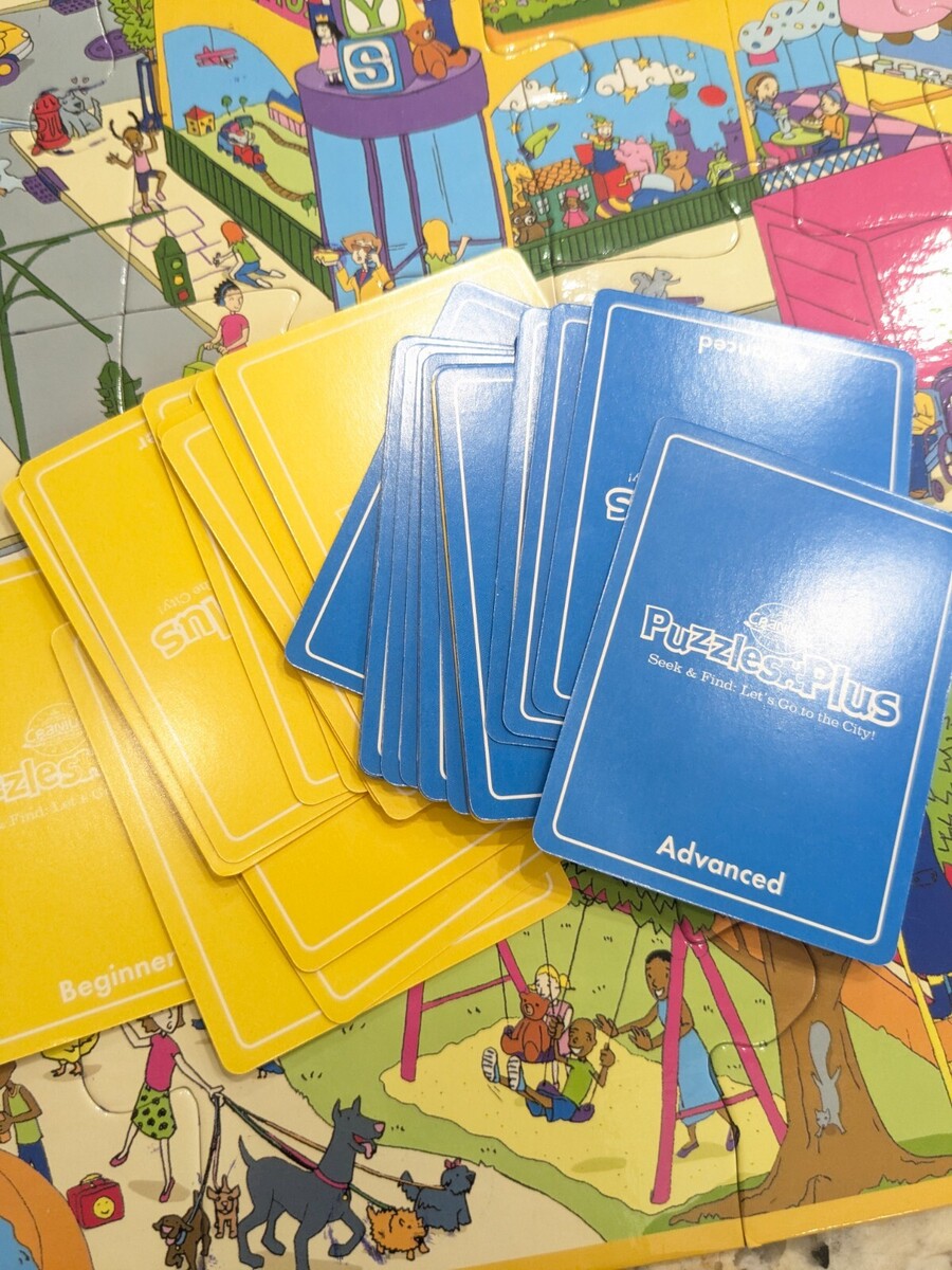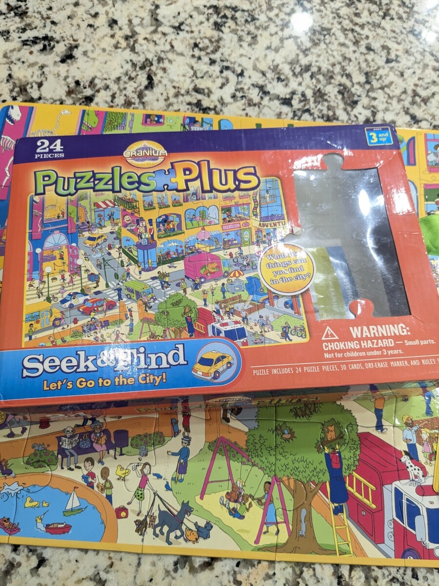 Cranium Puzzles Plus Seek Find Let's Go to the City puzzle game 24 pieces kids Includes all puzzle pieces. Missing 1 card and dry erase marker. Some minor wear from use as shown, but overall very good condition.