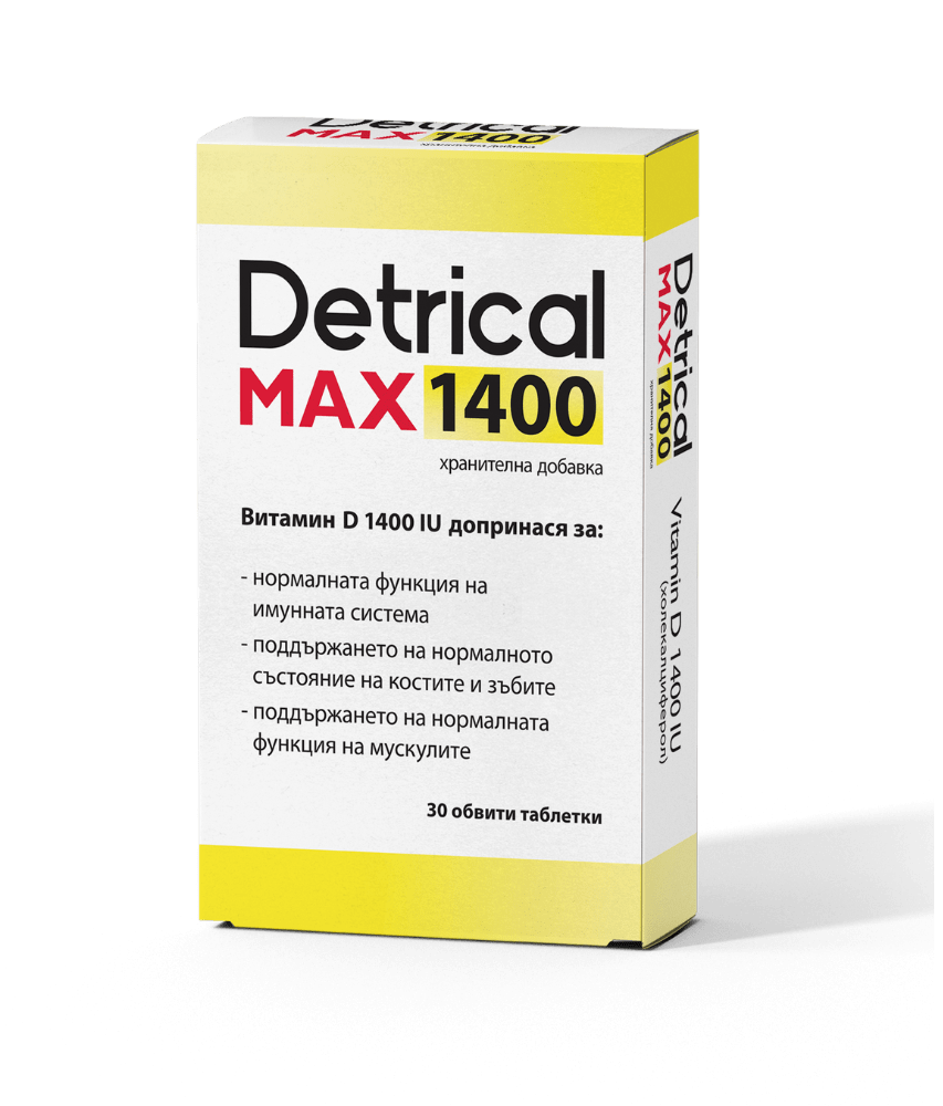Detrical MAX 1400 IU contains high-quality vitamin D3 (cholecalciferol), the natural and most bioavailable form of vitamin D. It supports the normal function of the immune system, the health of bones, teeth and muscles. Especially suitable for limited sun exposure, increased needs or vitamin D deficiency. The