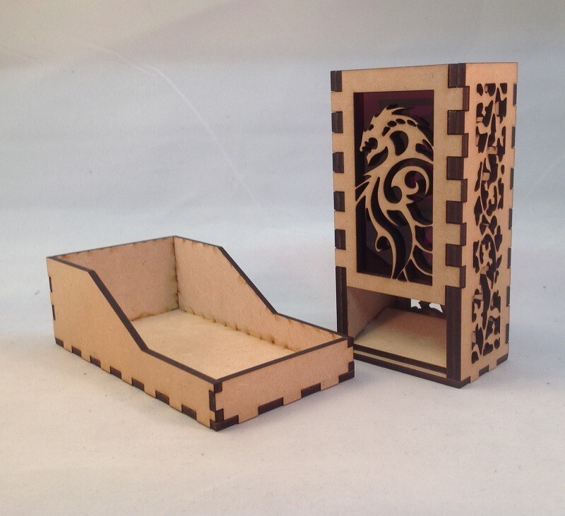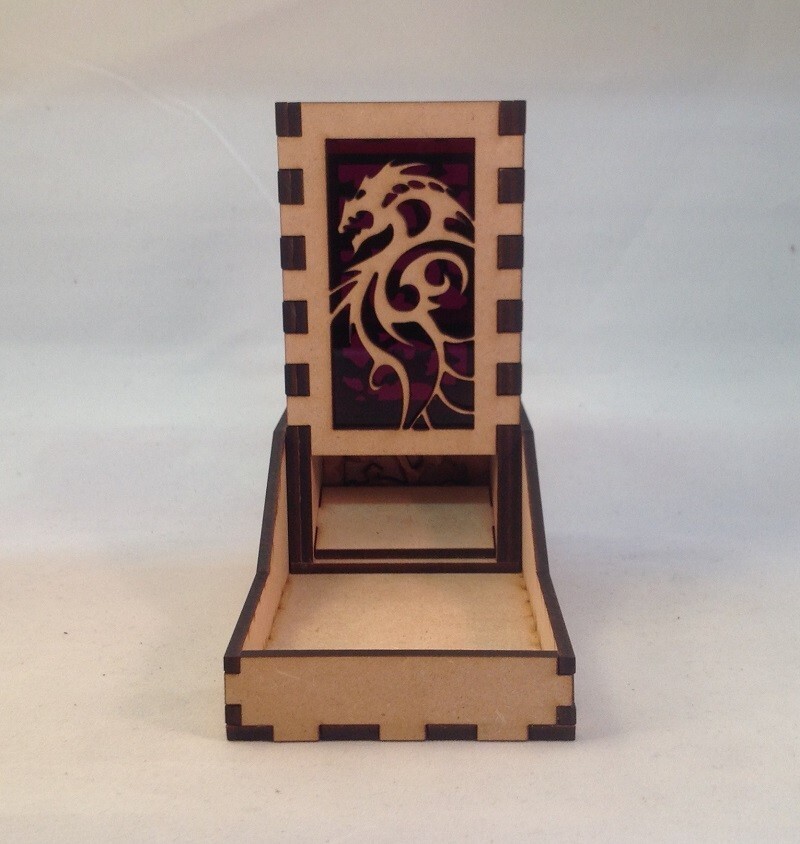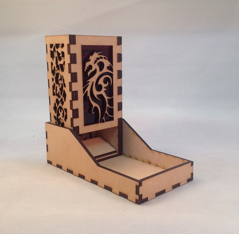 - Dragon v6 Dice Tower and Tray Purple Acrylic Window COMPACT DESIGN Laser Cut MDF