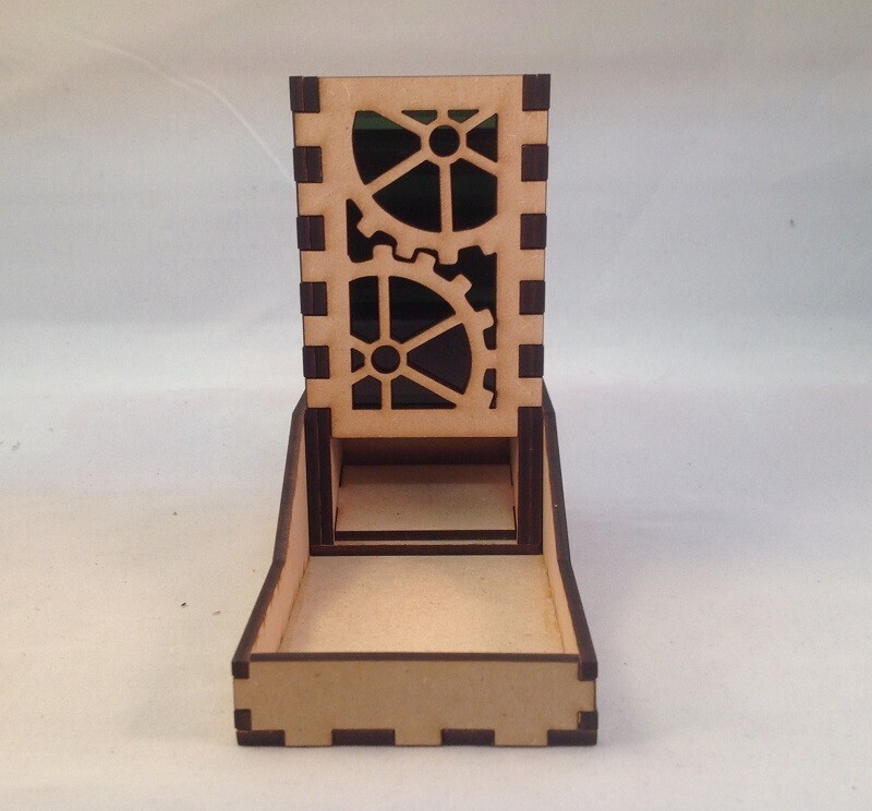 - Gears Dice Tower and Tray Green Acrylic Window COMPACT DESIGN Laser Cut MDF