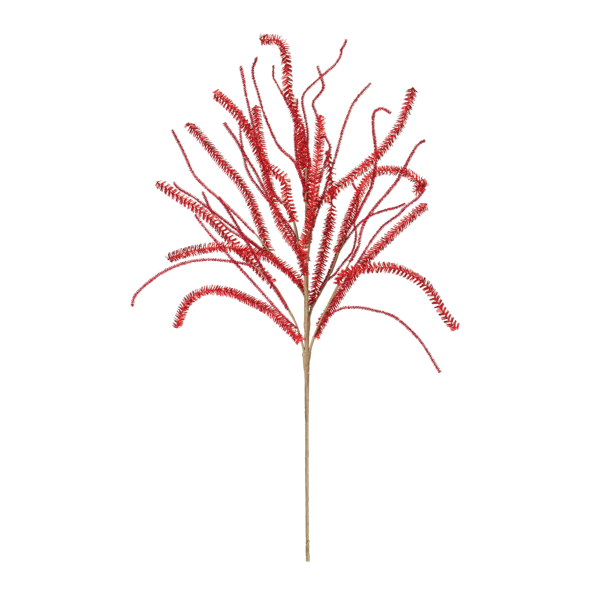 Festive Elegant: Vibrant red glittered pine branches with shimmering tinsel accents add a touch of holiday sparkle. Versatile Decoration: Ideal for Christmas trees, wreaths, table centerpieces, and seasonal arrangements. Durable Reusable: Made from high-quality plastic to ensure long-lasting use year after year. Suitable for indoor use only
