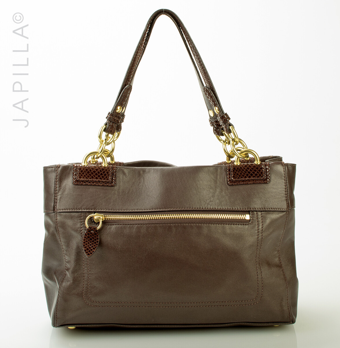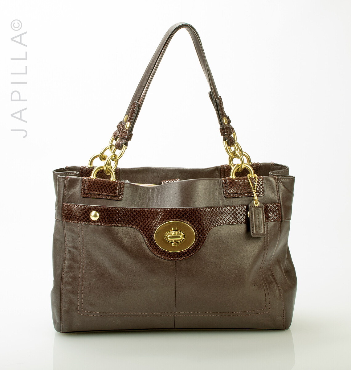 Brass tone hardware. Large back zippered pouch, with turn lock in front.