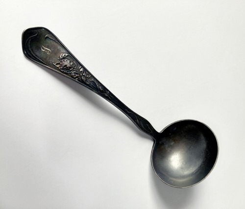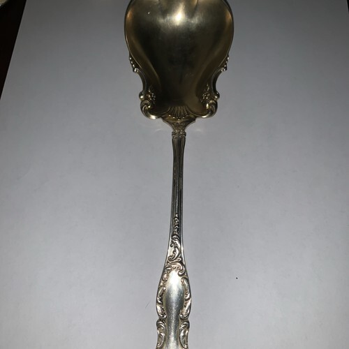 Silverplate PRESERVE SPOON GOLD WASHED 7 3/8" in the pattern IRIS BY EHH SMITH. It is NOT monogrammed and is in very good, clean condition.