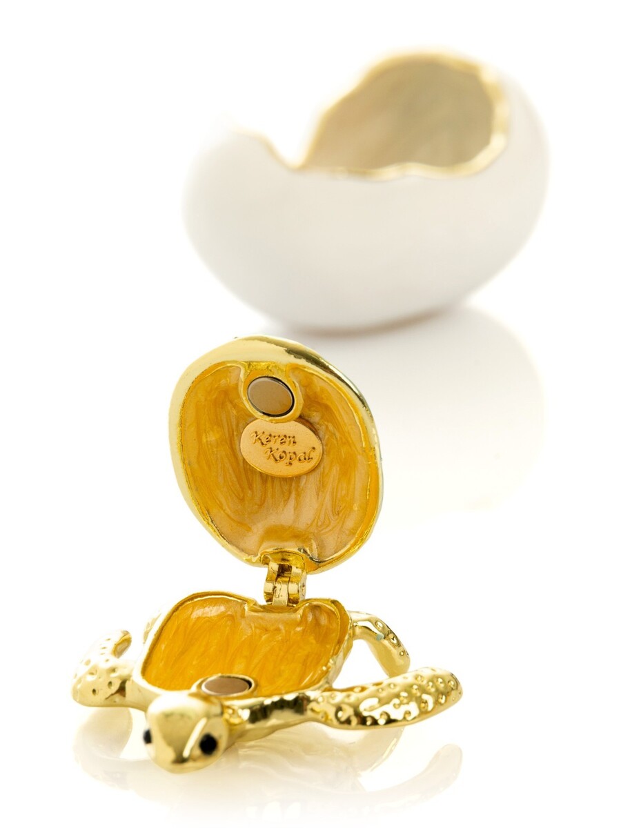 The Keren Kopal Turtle Hatching Trinket Box is a handmade decorative piece adorned with Austrian crystals, featuring a unique honeycomb pattern and a gold plated finish. This Art Nouveau style trinket box is suitable for all occasions and is designed in the shape of a turtle, making it a charming addition to any room. With a size of 5.2 x 4.1 x 4.2 cm, this collectible item from the Animals collection includes a magnetic closure and is crafted with enamel, metal, and crystal materials. Made in Israel, this original piece by Keren Kopal is a colorful and whimsical find for collectors and animal lovers alike.