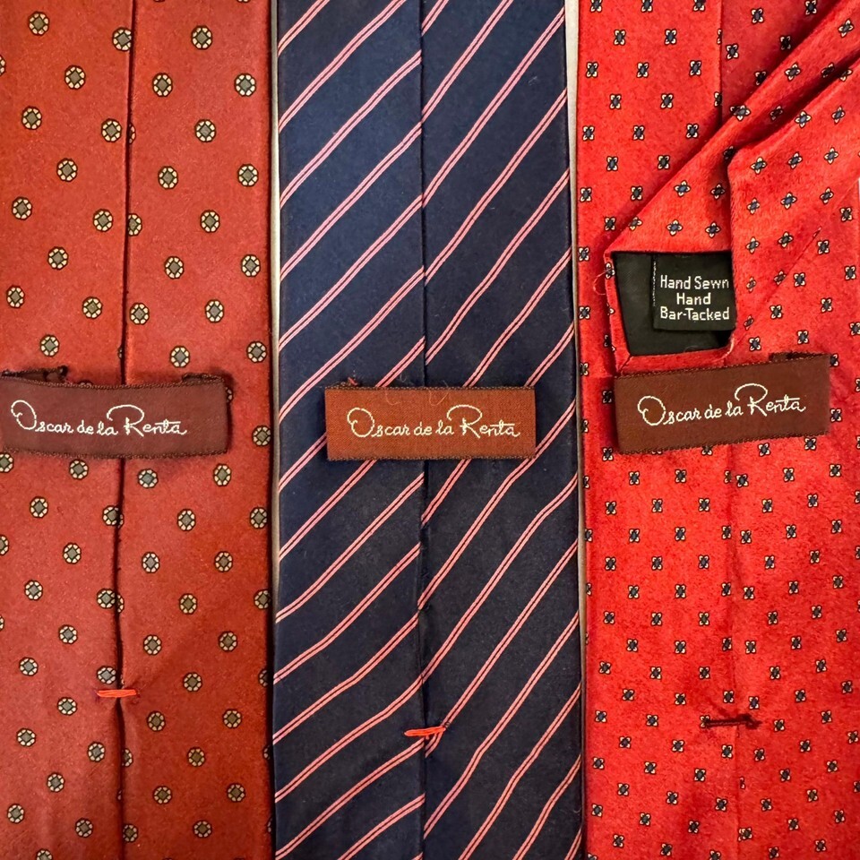 - Lot of 3 Oscar de la Renta Silk Ties Vintage 1980s Hand Sewn Red Navy Geometric