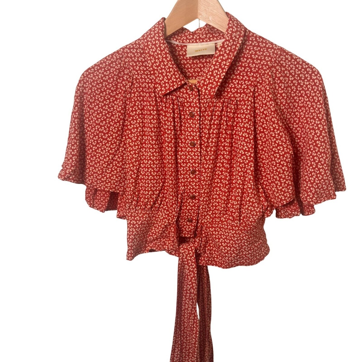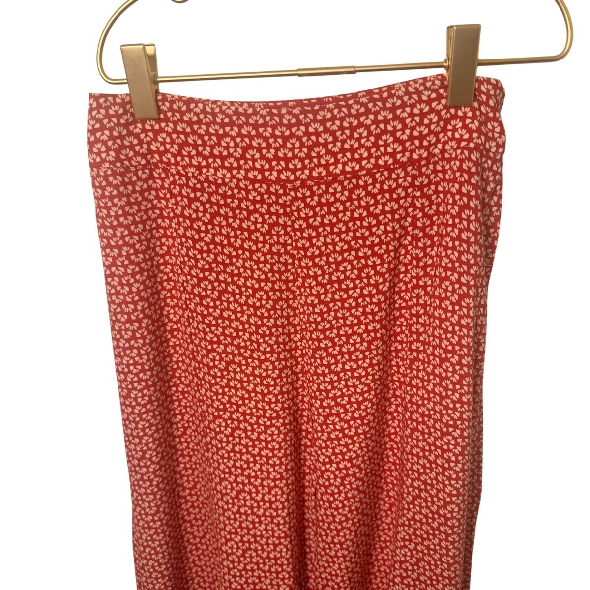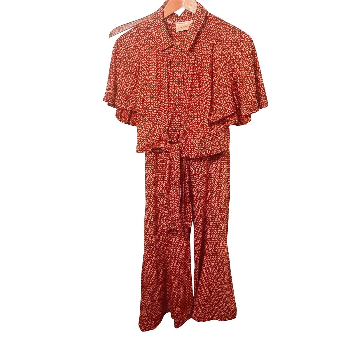 Keywords: Maeve, Anthropologie, floral print, tie front blouse, cape sleeves, wide leg pants, matching set, boho, red, petite, 0P, rayon, blouse and pants set, bohemian