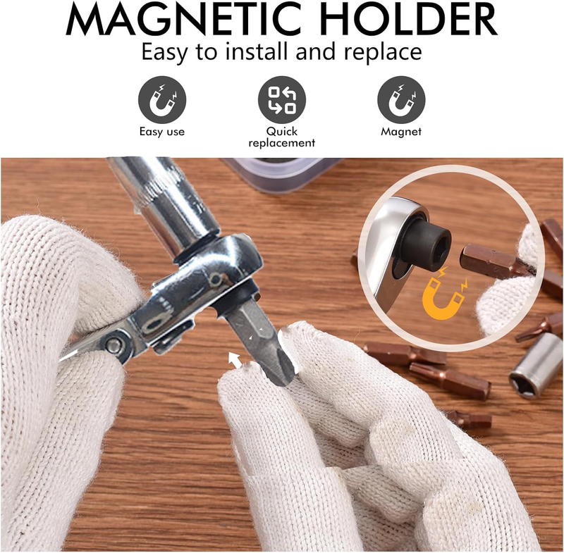 Efficient Ratcheting Mechanism: Featuring a reversible 72-tooth ratchet system, this mini bit ratchet provides smooth operation with a minimal swing arc at 90 degree. Quickly change direction without removing the tool from the fastener, boosting speed and efficiency during tasks.