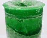 The votive candle measures approximately 2 inches (5.08cm) tall, has been colored green, and is scented with the scents of nutmeg, clove, citronella, cinnamon, rain, and myrrh. Made in the U.S. by Crystal Journey Candles.