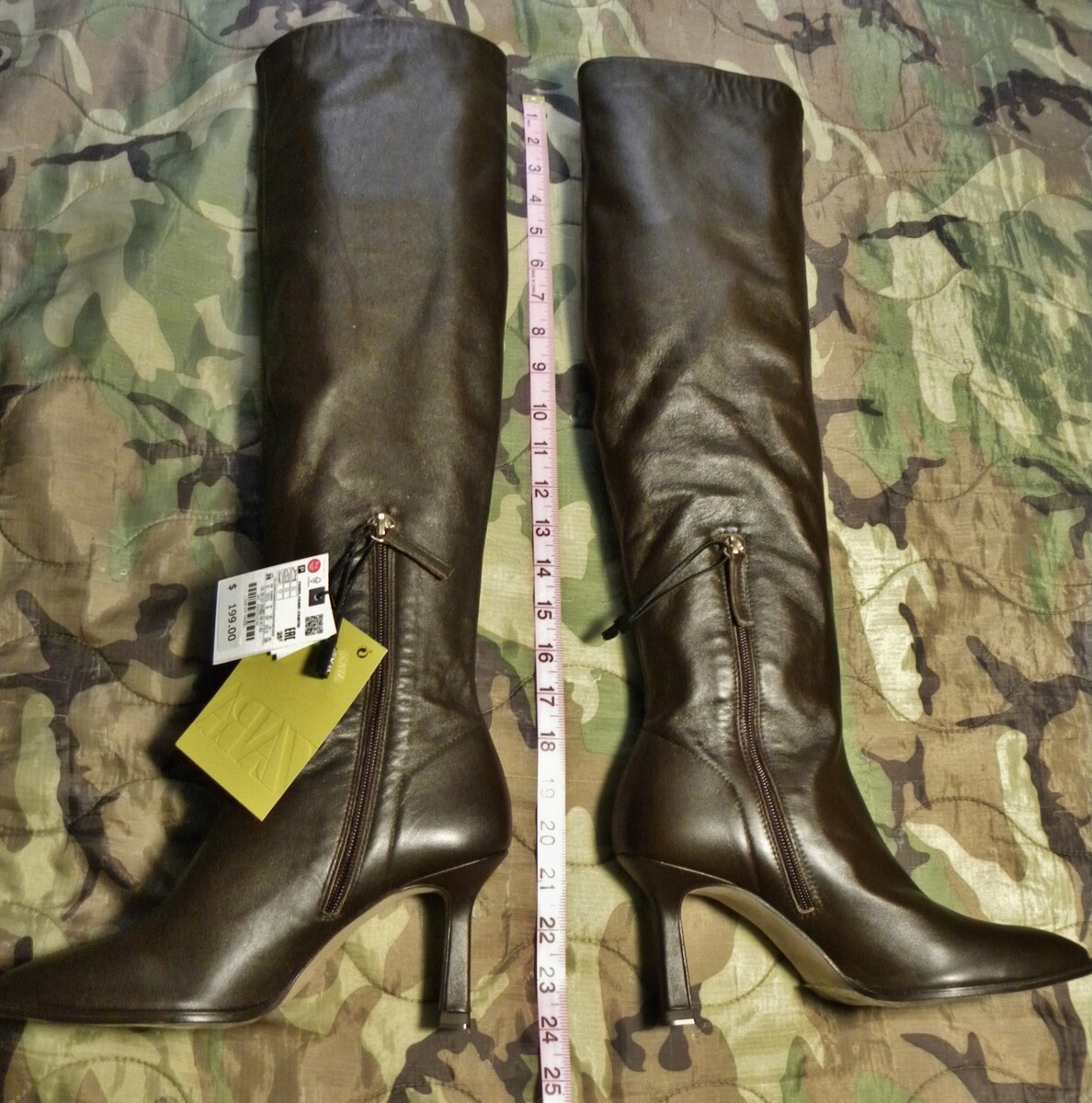 For sale: New with Tags ZARA Leather Over the Knee Boots in Women's size 8, but measuring your feet or a pair of your boots with LIKE: toe is mandatory for a proper fit then refer to the measurements and measure your feet! Each Maker sizes differ. These Tall Deep Chocolate Brown Boots are made of Leather and feature trendy compfy square toes, kitten heels, smooth leather outsoles, and 8" vertical medial zippers on each side. ZARA is printed inside on the heel part of the insert. Retail Tags: $199.00. Please view ALL photos so you know what you are buying.