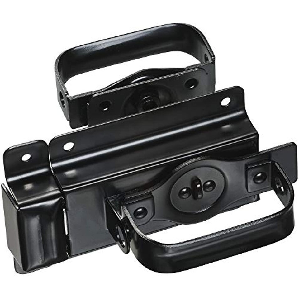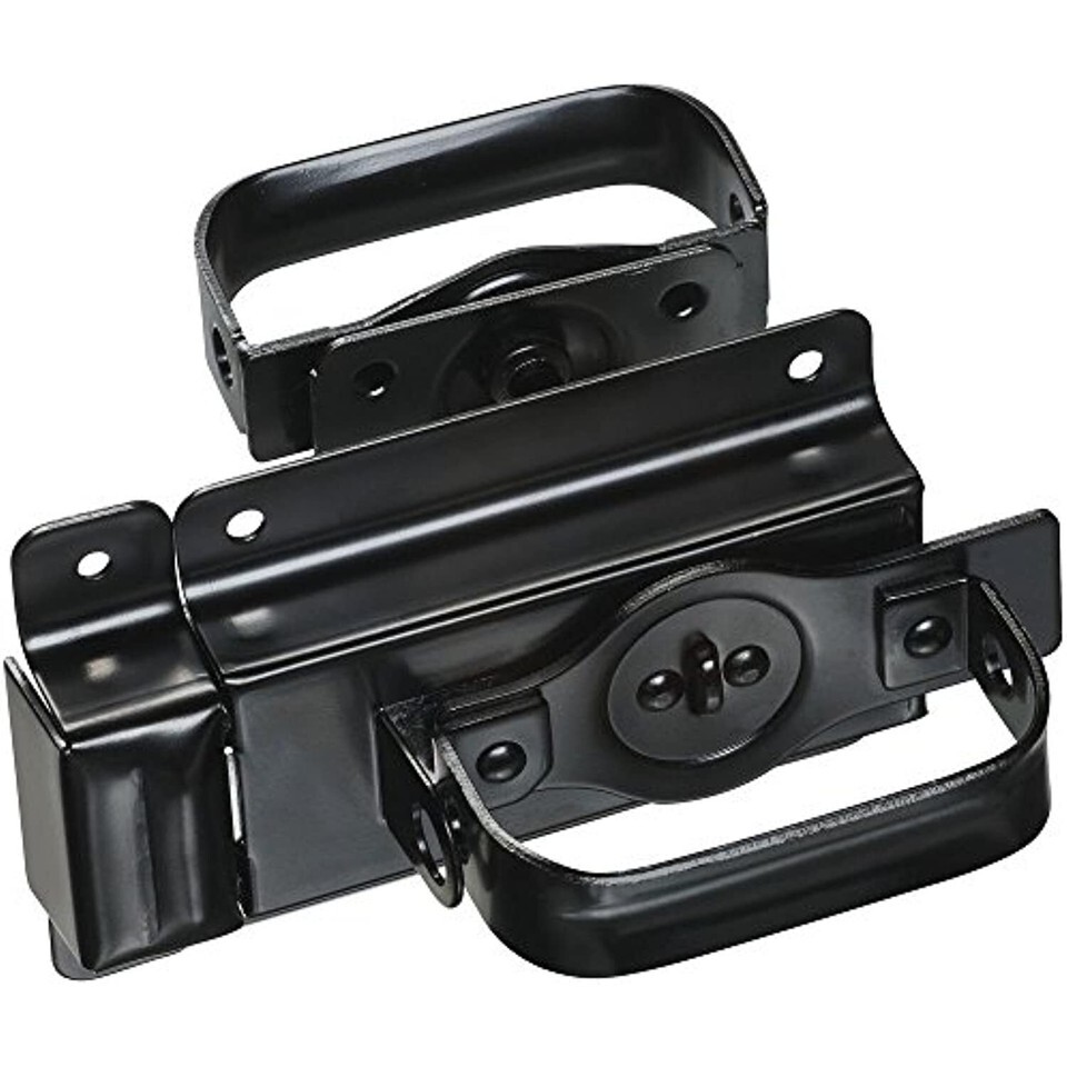 Product Description National Hardware V25 Swinging Door Latch is great for use on gates and doors where a self-latching action is desired. Designed for swinging doors on storage sheds barns, out-buildings, etc. Heavy duty design with added security feature allows the use of a padlock to prevent opening. Handle is designed to prevent flattening if door slams against building. Latch can be operated from either inside or outside of door. Finish: Black Material: Steel A heavy duty latch designed for swinging doors on storage sheds barns, out-buildings, etc Designed for right or left handed applications Latches automatically Can be padlocked for added security Handle is designed to prevent flattening if door slams against building Can be operated from either inside or outside of door Wide strike allows for door sag Bolt has rounded face for easy latching Bracket is provided to hold door open Visual Pac. From the Manufacturer Automatic gate latch designed for most gates, fences, doors and animal pens. Strike can be mounted to gate or post