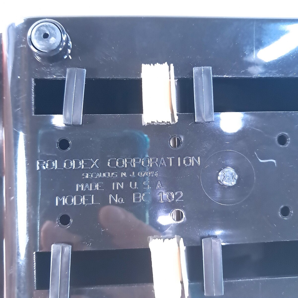 ROLODEX BC-102 covered Business Card box File Organizer Divider Black Plastic Shiny/glossy black plastic. Includes dividers as shown. Some scuffs/scratches as shown. See pics.