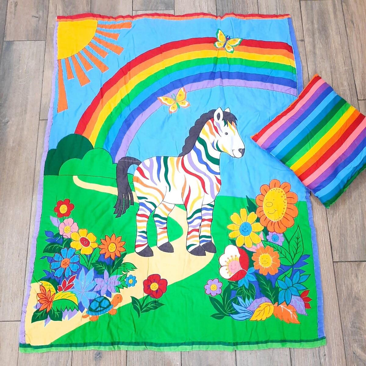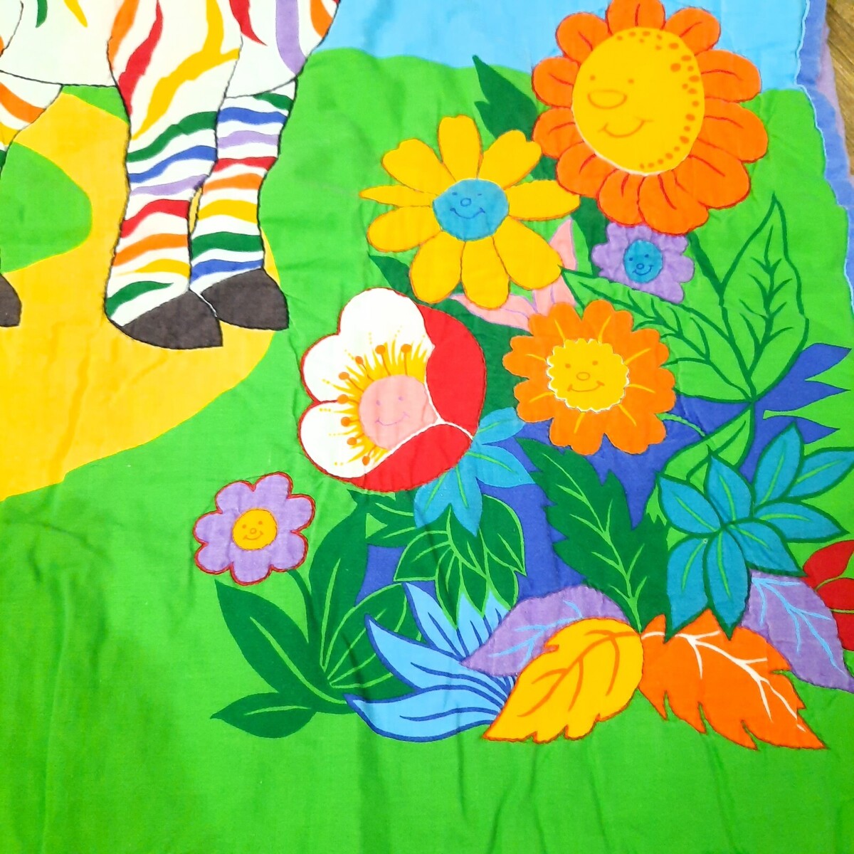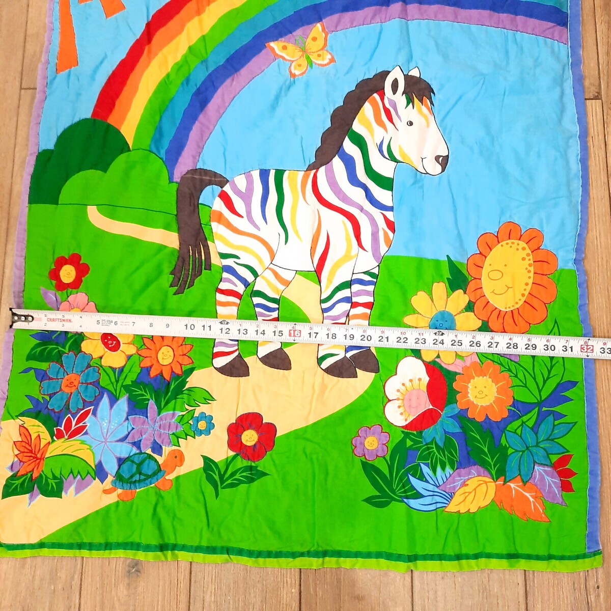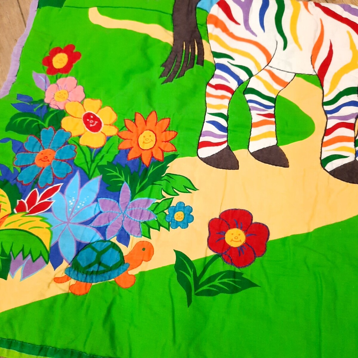 Rainbow Zebra Quilt Baby Blanket comforter toddler kids w pillow bright handmade Very bright happy colors! Handmade. Small hole on the back and imperfection in the print on the Zebra's tail as shown. Otherwise very good condition. Includes small pillow. See pics for measurements.