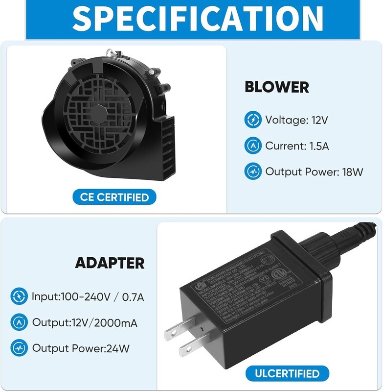 All-in-One Replacement Kit: Comes with a powerful 12V 1.5A blower, a UL-certified 2.0A adapter, and a 16.5 ft LED string with 8 bright LEDs ? inflate your inflatables fast and light them up beautifully!