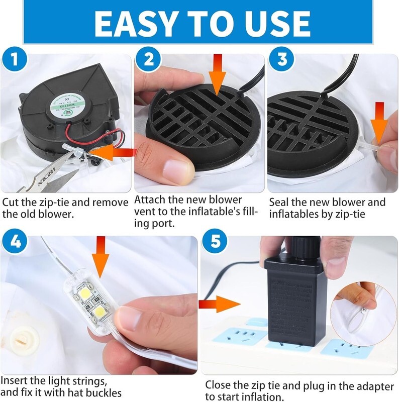 Easy to Set up: The steps to replace the fan blower are very simple. We provide detailed installation videos and instructions. Connect the adapter of the blower to the power supply, the blower will provide a stable air flow for the beautiful inflatable toy, which can support keeping the inflatable toy full of air all the time. The buckles can help you secure the light string position inside the inflatable decoration.