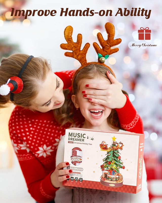 ? [Enchanting Holiday Scene] - Immerse yourself in the spirit of Christmas with the Robotime Rolife Christmas Melody Tree Music Box. This beautifully crafted 3D wooden puzzle showcases a delightful holiday scene where Santa joyfully descends a decorated tree, surrounded by presents and shimmering lights. The intricate details, including a sleigh pulled by flying reindeer, create a captivating display that will charm all who behold it.