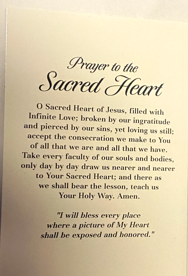 Your purchase is for a blank note card with an image of Sacred Heart of Jesus on the front. The back contains the prayer to the Sacred Heart.