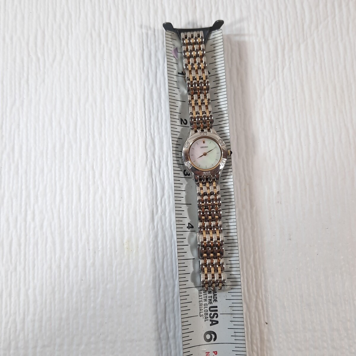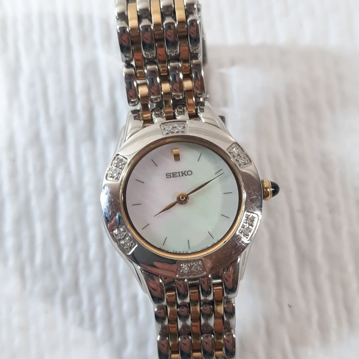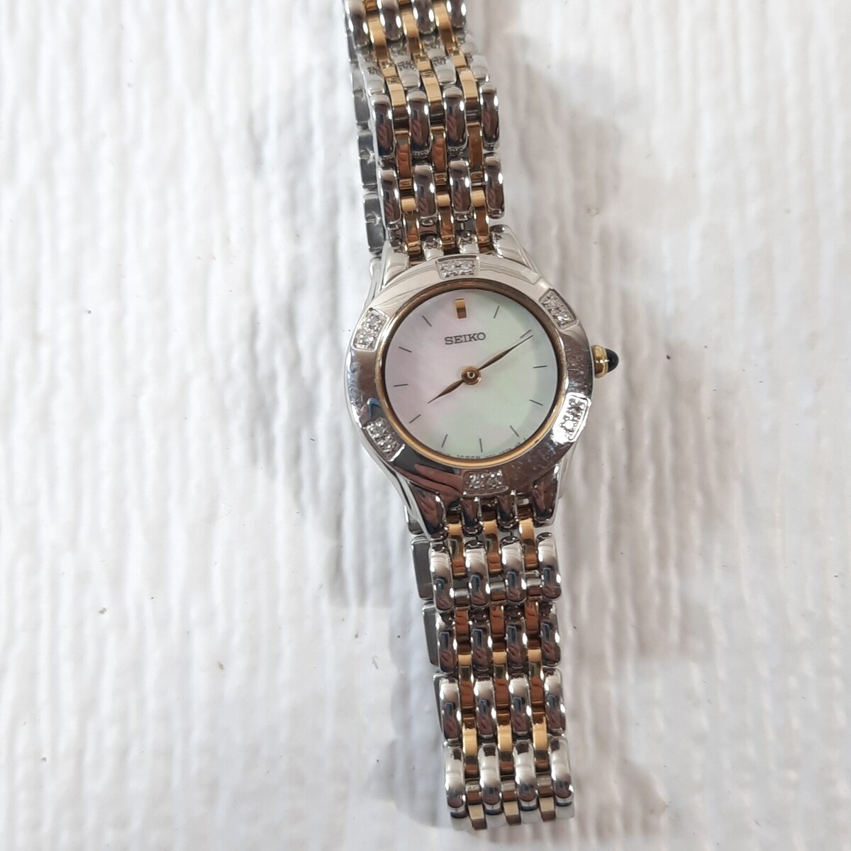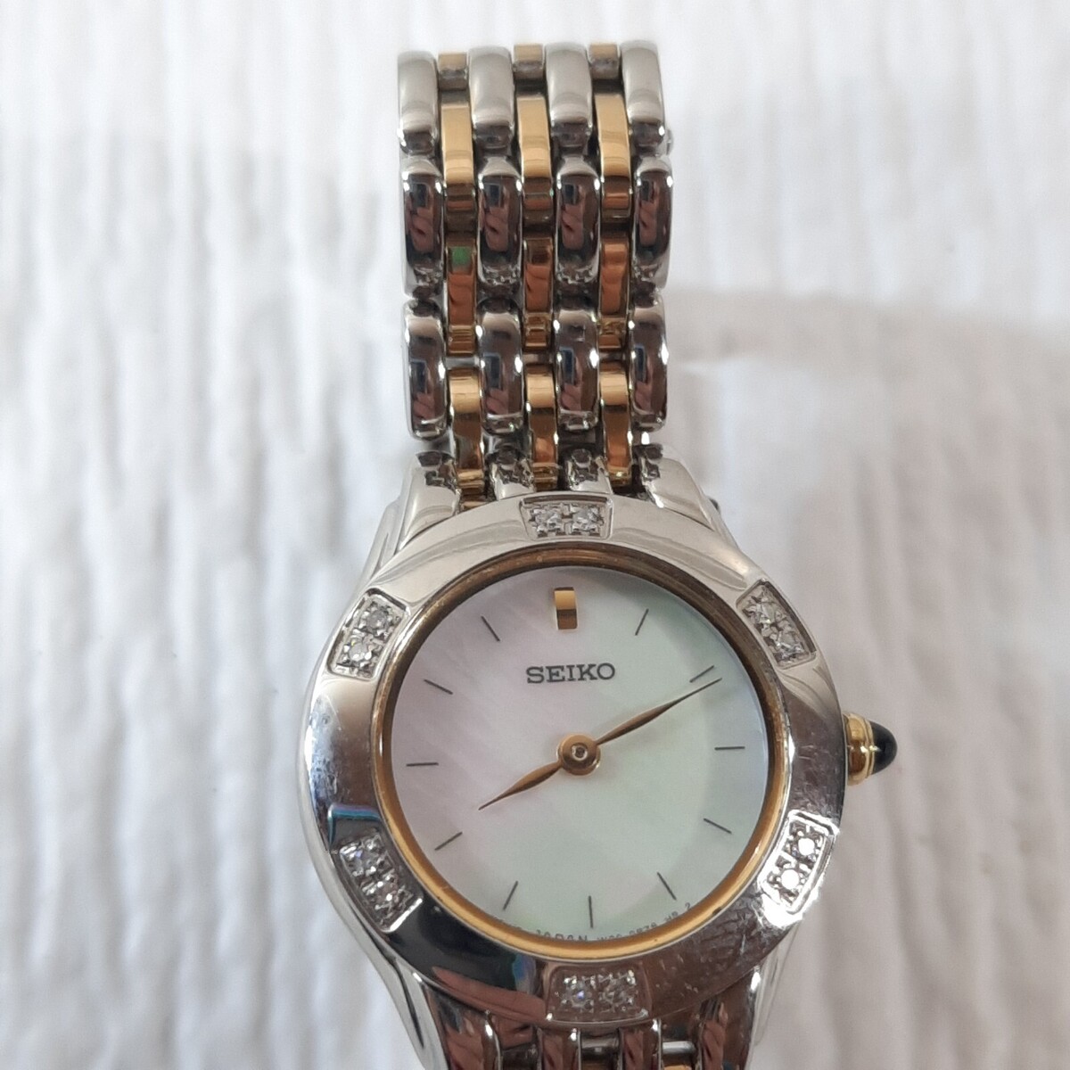 Seiko Women's Watch SUJC47 Mother of Pearl Dial Two Tone Stainless Steel Diamond Needs a new battery. Lovely watch. Very minor wear from use. Gold/silver tone with mother of pearl round face. Gorgeous!