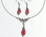Beautiful Set of silver-tone Antique style red Chameleon fine faceted teardrop shaped Crystal beads necklace and earrings. Silver-tone pendant Victorian style necklace and earrings. Boho necklace. Bohemian necklace and earrings. Romantic necklace and earrings. Beautiful necklace with same style earrings with filigree ornaments and fine red faceted crystal beads .