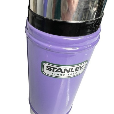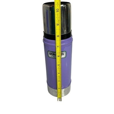 Stand out with this Stanley Classic Vacuum Bottle in a rare purple color. This 16oz (0.5 quart) thermos is built tough with Stanley?s signature double-wall insulation, keeping drinks hot or cold for hours. Features a stainless-steel lid that doubles as a cup and a twist stopper for easy pouring. Preowned with light cosmetic wear on the base (see photos), but clean inside and ready to use. A great addition for collectors, or anyone looking for a bold, retro Stanley thermos.