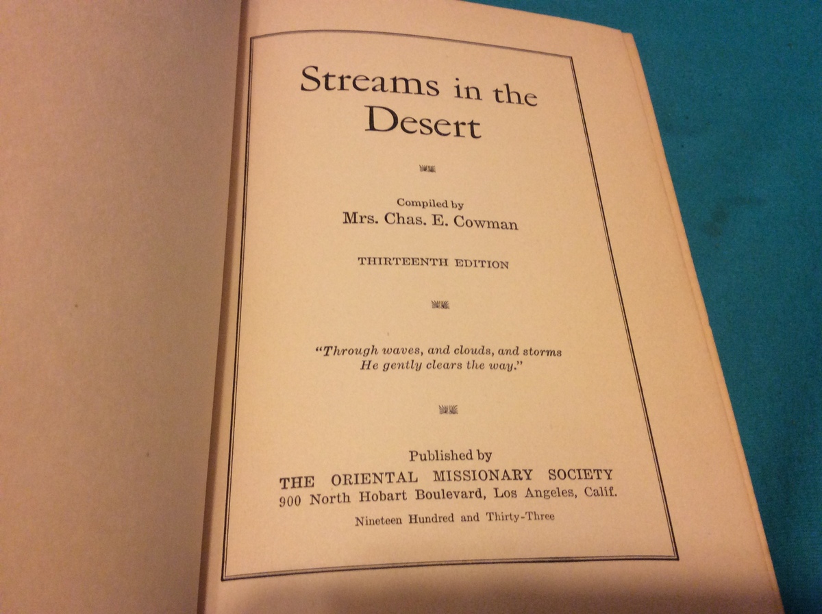 STREAMS IN THE DESERT by MRS. CHAS E. COWMAN LIKE NEW CONDITION 13TH EDITION 1933 STATED HARDCOVER ONLY, NO DUST JACKET BOOK APPEARS TO HAVE NEVER BEEN OPENED or READ EXCELLENT COLLECTIBLE IN EXCELLENT CONDITION PAGES ARE CLEAN, NO MARKS, NO BENDS, NO NOTES AND OUTER COVER AND SPINE ARE FIRM AND STABLE In stock and ready to ship Once payment is received, shipping will be next day PICTURES ARE OF THE ACTUAL BOOK BEING SOLD (NO STOCK PHOTOS USED) FREE SHIPPING TO ALL 48 STATES THROUGH USPS MEDIA MAIL ALL BOOKS WRAPPED AND SHIPPED IN BOX NO SHIPPING TO ALASKA OR HAWAII