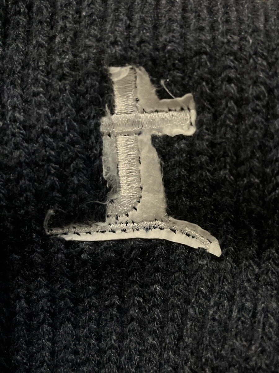 The North Face blue gray knit beanie in a soft ribbed acrylic knit with fold-over cuff and side logo tag. Includes a custom embroidered **?T? monogram** added by a previous owner (not original to The North Face). One size, unisex.