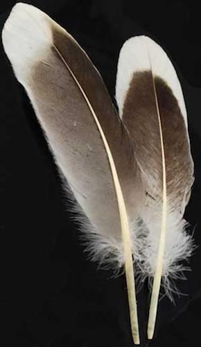 Plucked from a goose, these feathers are colored in the natural gray, brown, and white tones in which they are found.