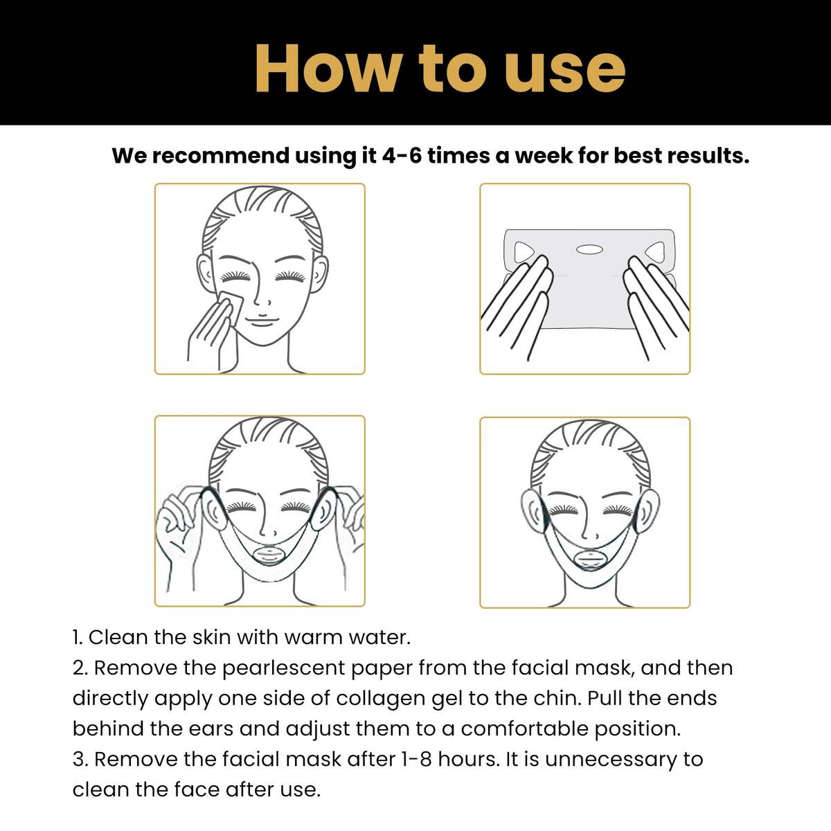 Our V-shaped face lifting facial mask contains water, glycerin, centella asiatica extract. It can reduce double chin and resist sagging, lifting mandibular line, moisturize skin, reduce wrinkles, slim face shape, removing chin fat. Its use method is very simple: Clean the skin with warm water. Remove the pearlescent paper from the facial mask, and then directly apply one side of collagen gel to the chin, pull the ends behind the ears and adjust them to a comfortable position. Tighten the chin and neck, increase elasticity, moisturize the skin, reduce wrinkles and wrinkles on the nose, and make the skin look younger.