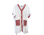 Fabric / Materials: White cotton terry cloth body; hand-stitched mola applique panels on collar and pockets.