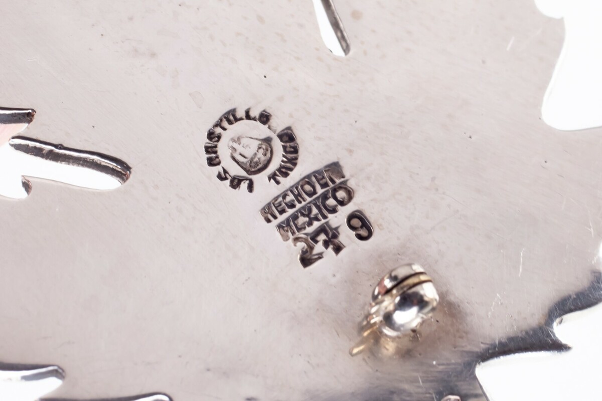 Vintage Taxco Mexican Los Castillo Sterling Silver Leaf Brooch with Turquoise Inlay