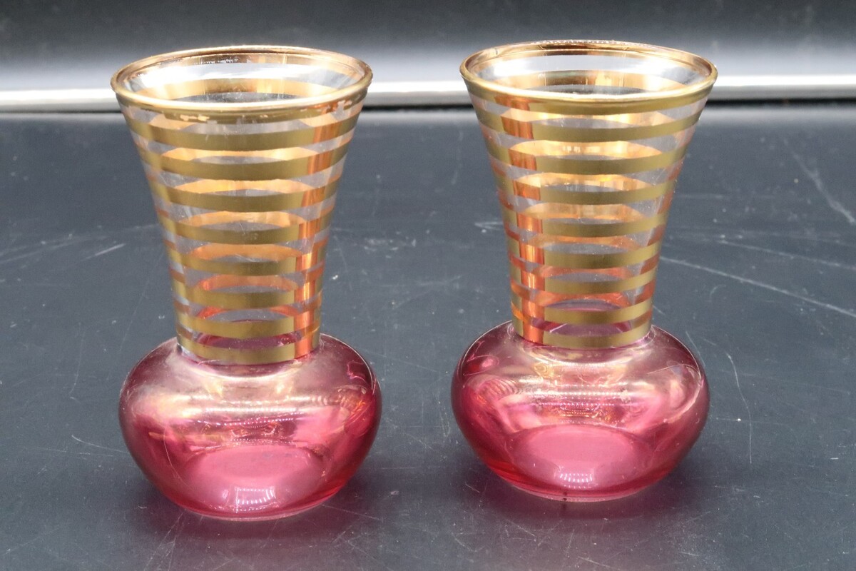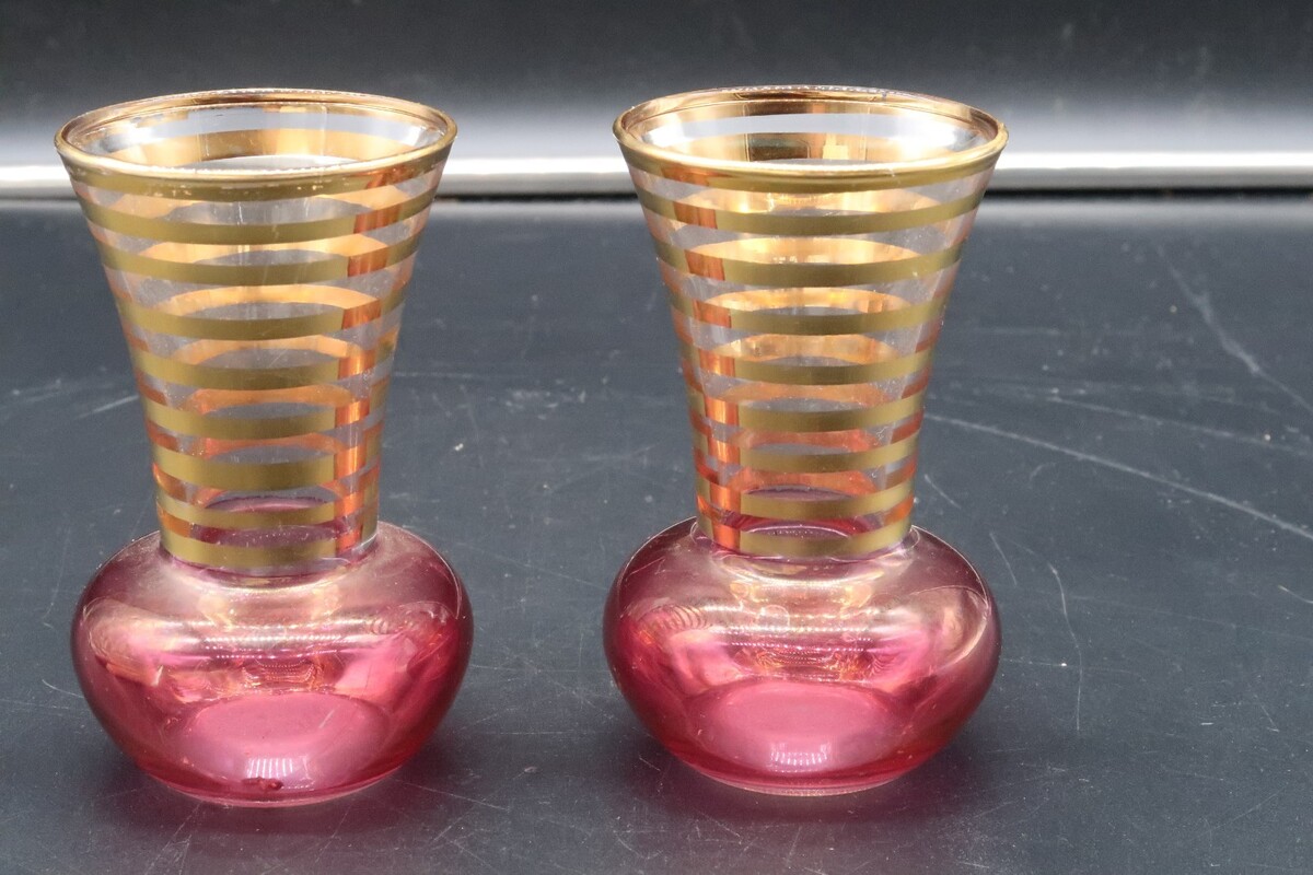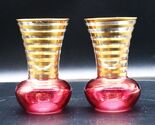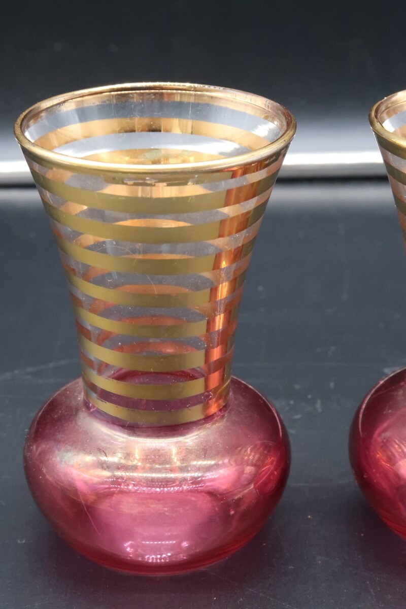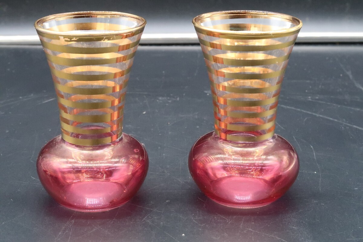Primary image for Vtg MCM Pair Bohemian Cranberry Glass Gold Striped Vases Bartlett Collins Style