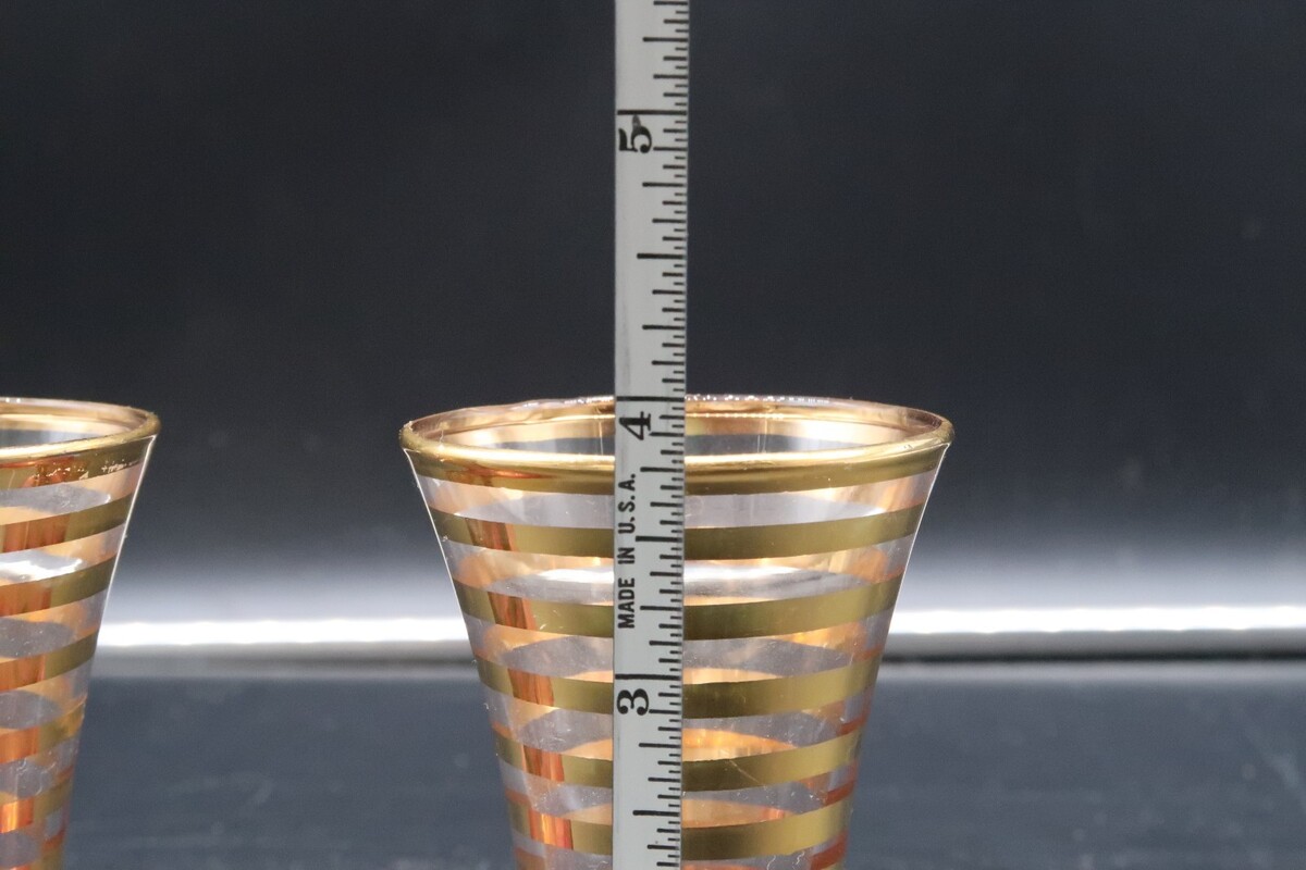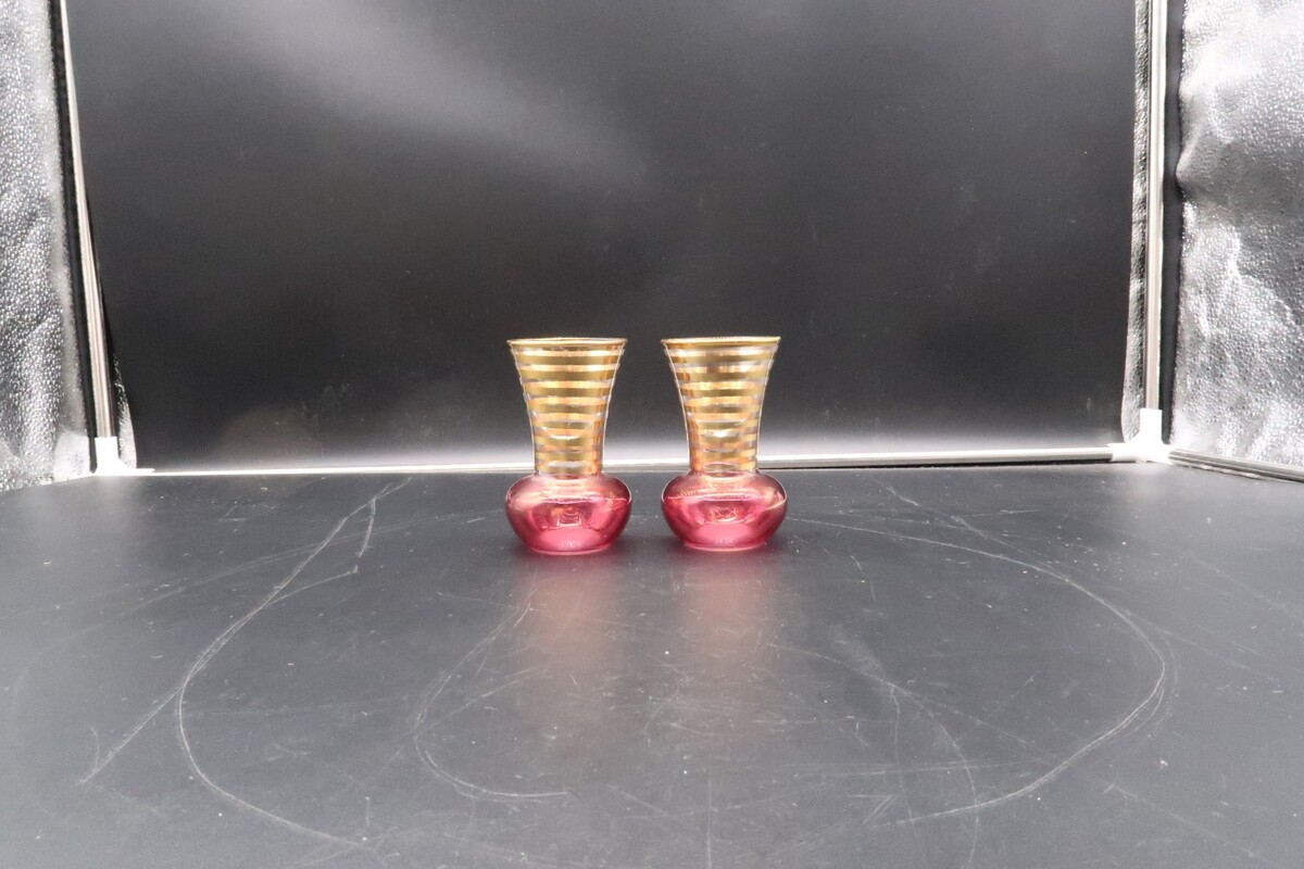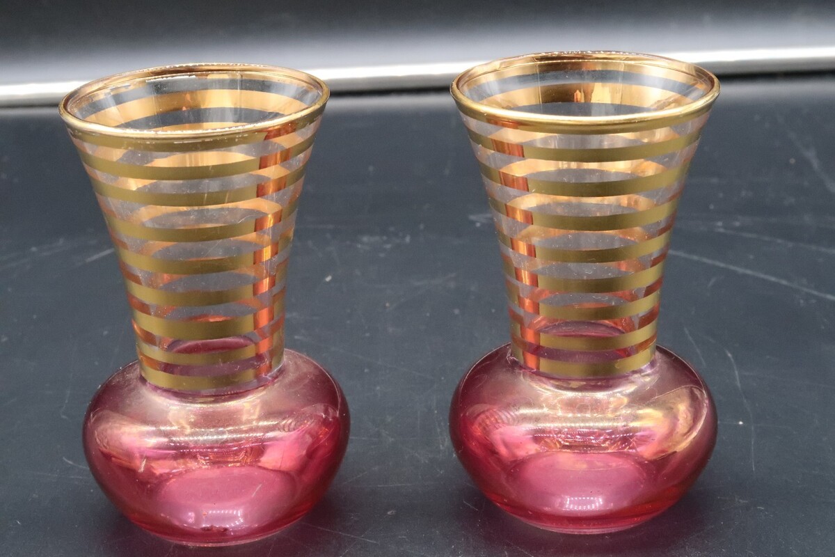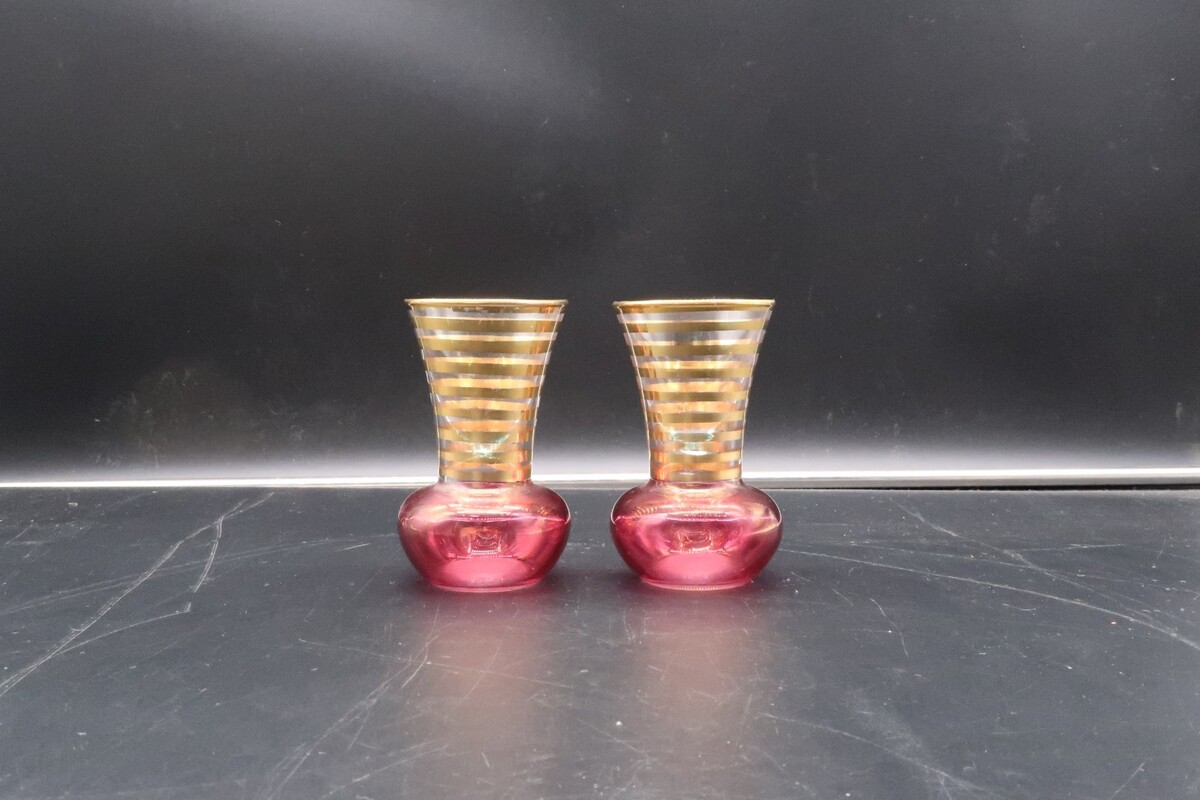 Primary image for Vtg MCM Pair Bohemian Cranberry Glass Gold Striped Vases Bartlett Collins Style